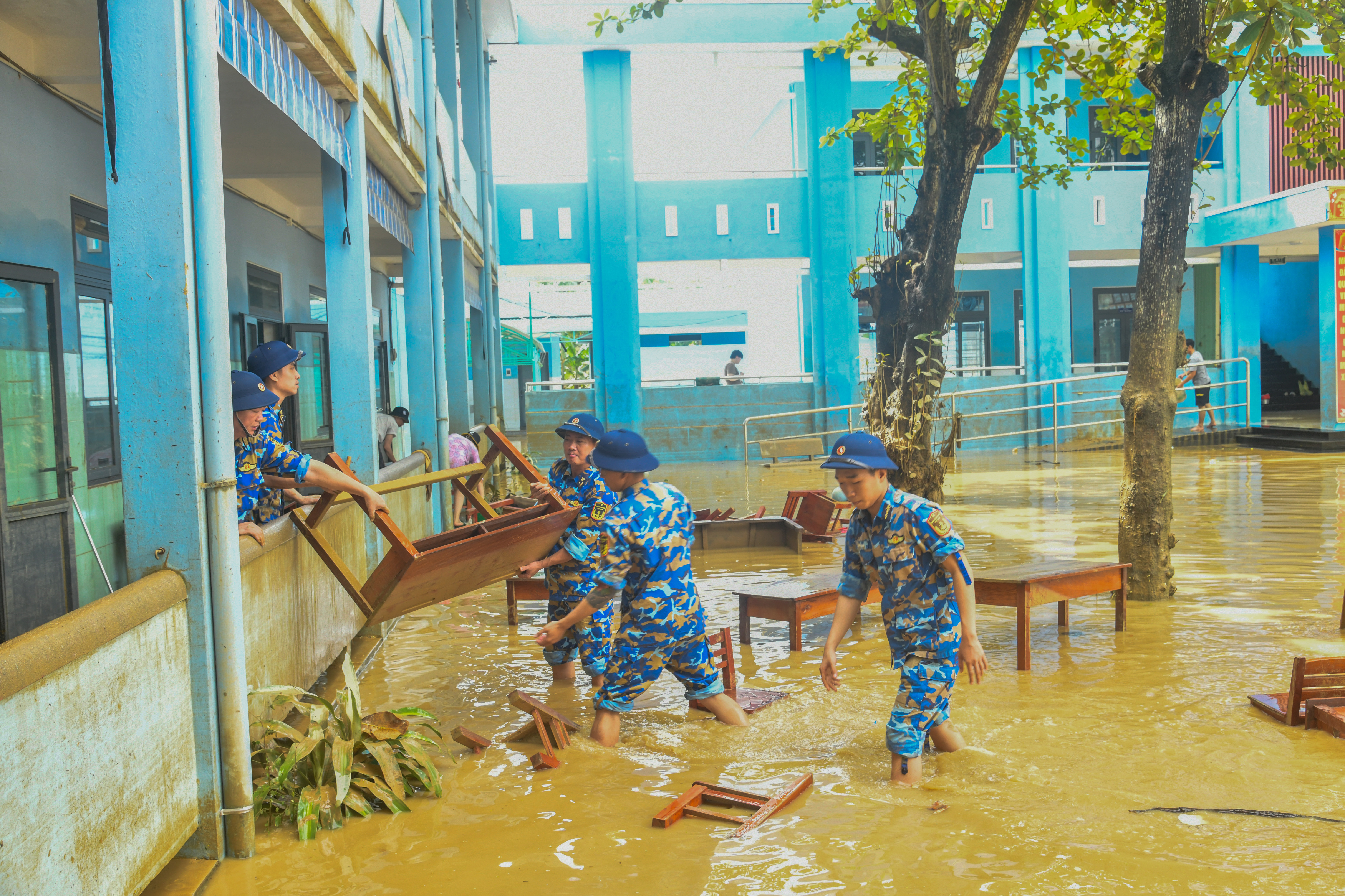 Trước đó, 30 cán bộ, chiến sĩ khác của Trung đoàn 351 cũng đã có mặt tại Trường Tiểu học Nguyễn Văn Cừ (phường Điện Bàn) nơi từng ngập sâu gần 3m. Suốt nhiều giờ liền, các anh miệt mài bơm nước, dọn bùn non, lau chùi bàn ghế, sửa chữa thiết bị điện hư hỏng.