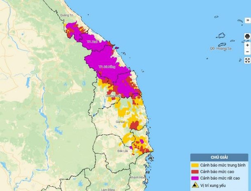 Cảnh báo cấp độ rủi ro thiên tai do lũ quét, sạt lở đất, sụt lún đất do mưa lũ hoặc dòng chảy: Cấp 1; thành phố Đà Nẵng: Cấp 2; thành phố Huế: Cấp 3.