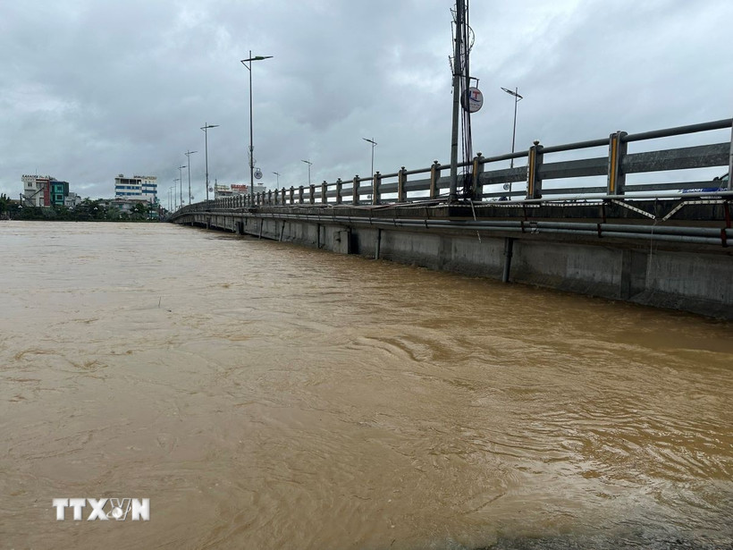 Nước lũ sông Trà Bồng đã áp sát cầu Châu Ổ. (Ảnh: TTXVN phát)