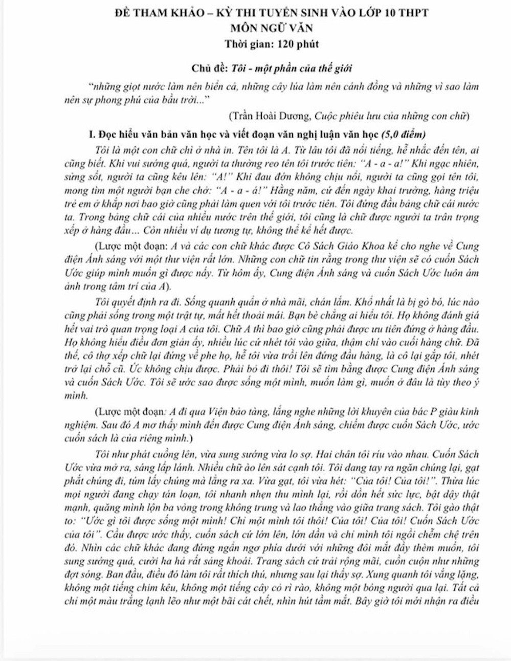 Phần đầu của đề thi mang chủ đề “Tôi - một phần của thế giới”, trích từ tác phẩm Cuộc phiêu lưu của những con chữ của nhà văn Trần Hoài Dương.