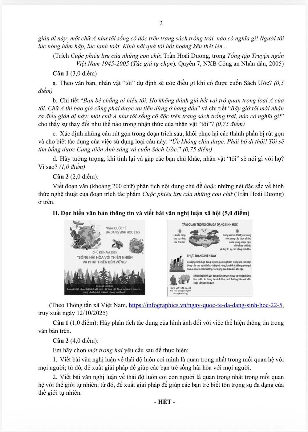Học sinh cần phân tích tác dụng của hình ảnh trong Infographic (1 điểm); Chọn 1 trong 2 đề Nghị luận xã hội (4 điểm): Viết về thái độ coi mình là một phần của thiên nhiên, hướng đến sự hài hòa với mọi người và môi trường và viết về thái độ tôn trọng sự đa dạng sinh học, đề xuất giải pháp giúp thế hệ trẻ nâng cao ý thức bảo vệ môi trường.