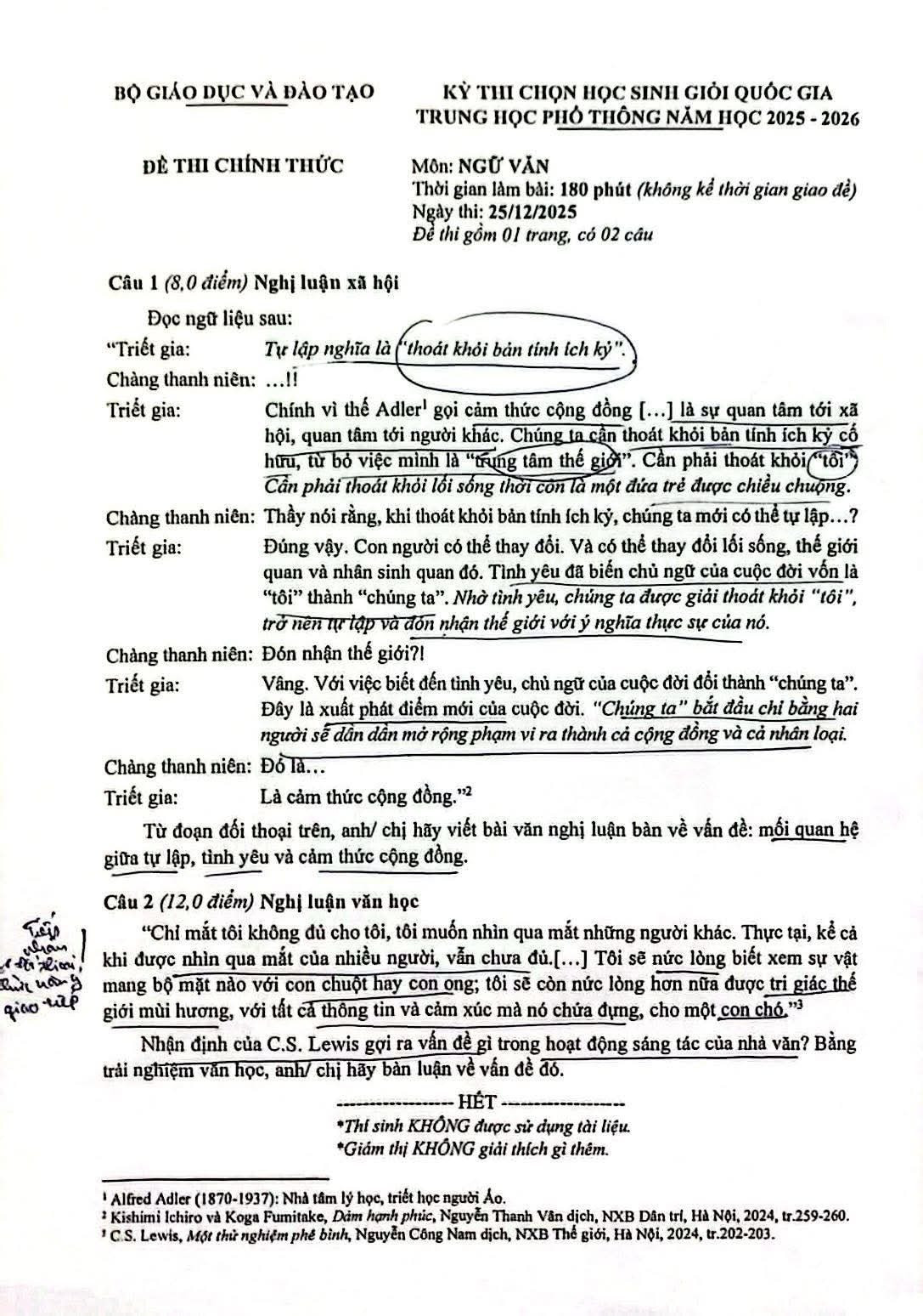 Đề thi HSG quốc gia môn Ngữ văn bàn về tự lập, tình yêu và cảm thức cộng đồng. (Ảnh: FB THPT Chuyên Hà Nội - Amsterdam)