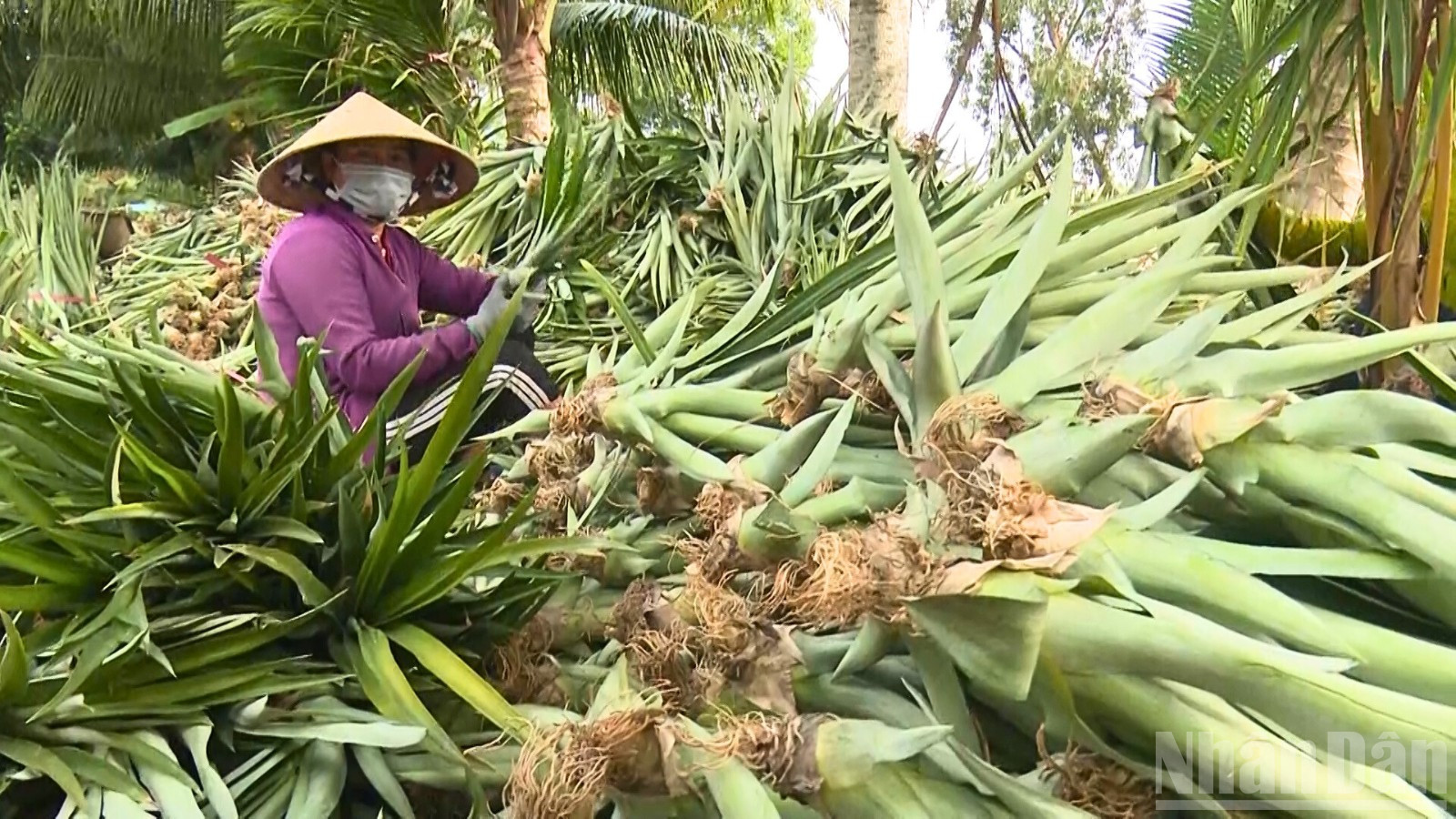 Bà con nông dân phân loại chồi giống khóm MD2 tại xã Phương Bình, thành phố Cần Thơ.