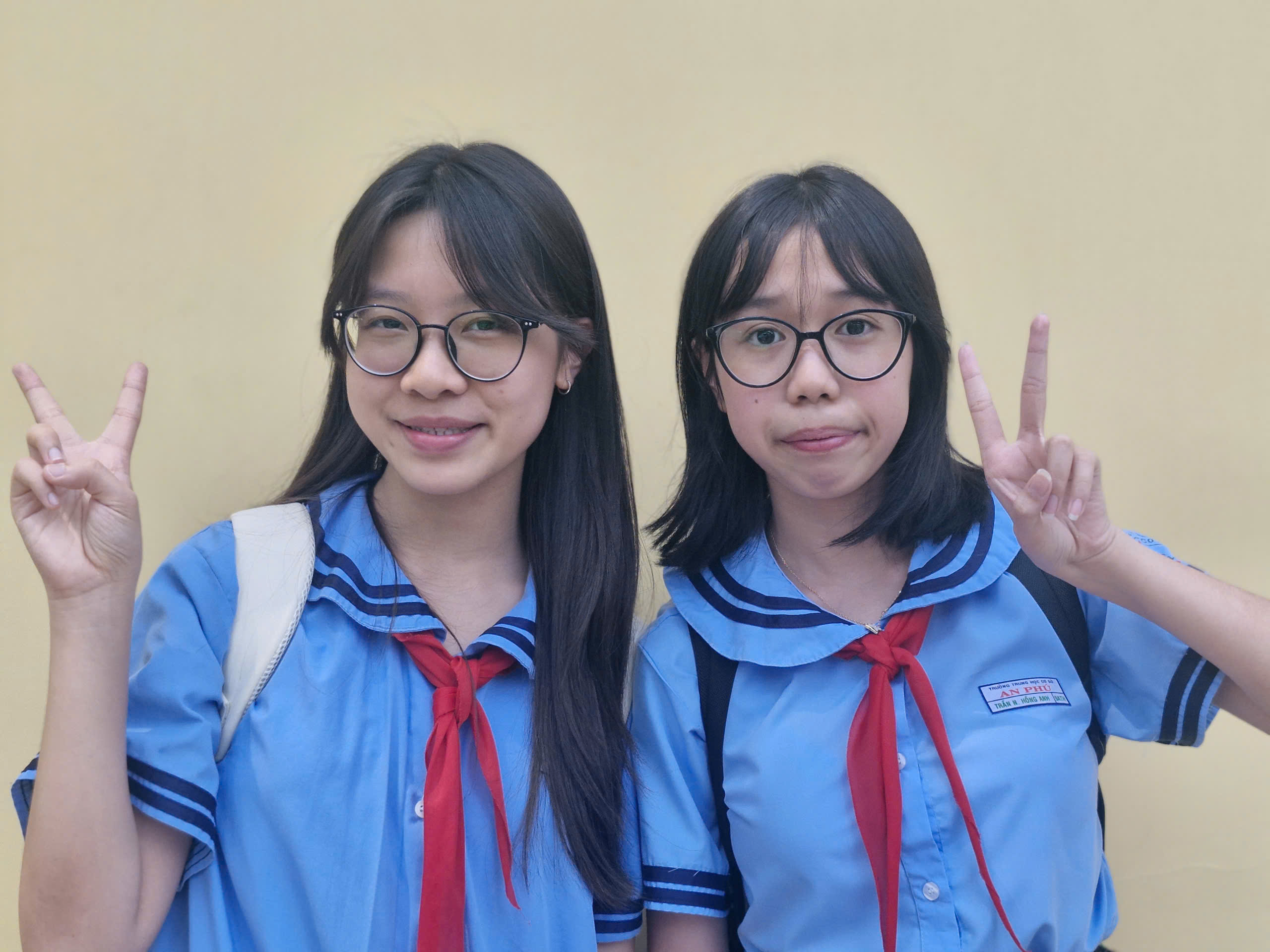 Các thí sinh Trần Bảo Diệp và Hồng Anh khá thích thú với đề Văn học sinh giỏi sáng nay. Ảnh: NGUYỄN QUYÊN