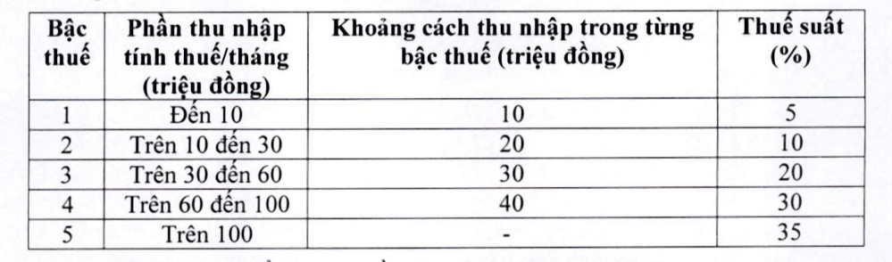 Theo phương án mới, bậc 1 áp dụng thuế suất 5% cho phần thu nhập tính thuế đến 10 triệu đồng/tháng nhằm giảm tải cho nhóm lao động thu nhập phổ biến. Bậc 2 áp mức 10% với phần thu nhập trên 10–30 triệu đồng/tháng; bậc 3 chịu thuế 20% đối với phần thu nhập trên 30–60 triệu đồng/tháng. Bậc 4 áp mức 30% từ 60–100 triệu đồng/tháng và bậc 5 giữ mức cao nhất 35% cho phần thu nhập trên 100 triệu đồng/tháng.