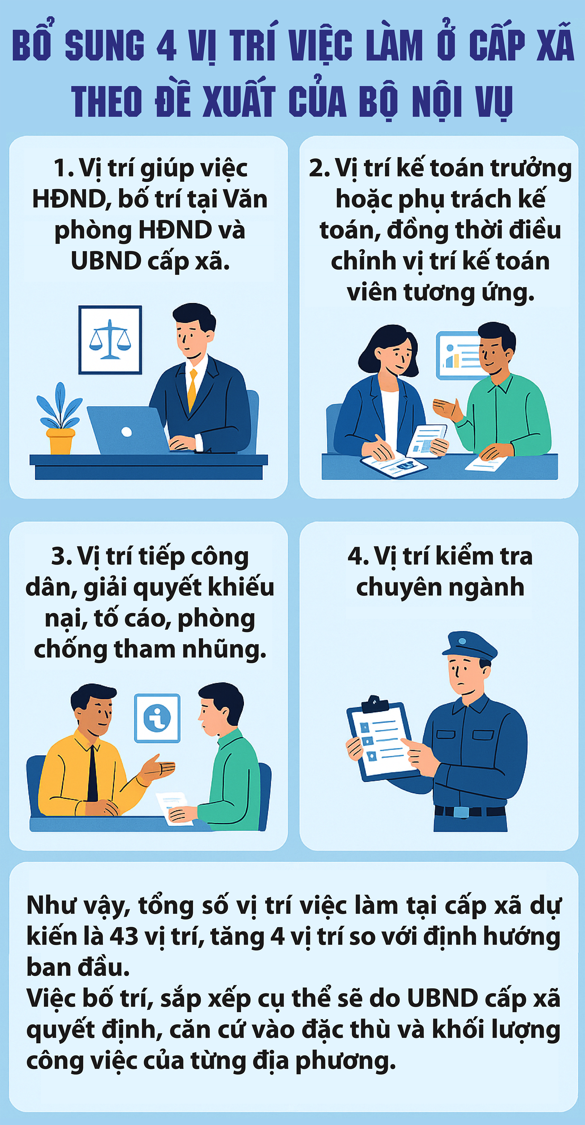 Trước đó, Bộ đã có công văn đề nghị các địa phương chỉ đạo cơ quan chuyên môn rà soát, đánh giá hiện trạng bố trí, sử dụng công chức và tạm thời định hướng danh mục vị trí việc làm tại cấp xã là 39 vị trí. Sau khi tổng hợp báo cáo từ 34 tỉnh, thành, Bộ Nội vụ nhận thấy cần điều chỉnh để phù hợp hơn với tình hình thực tế. Từ kết quả rà soát và kiến nghị của các địa phương, Bộ Nội vụ dự kiến bổ sung 4 vị trí việc làm ngoài 28 vị trí đã được định hướng trước đó.
