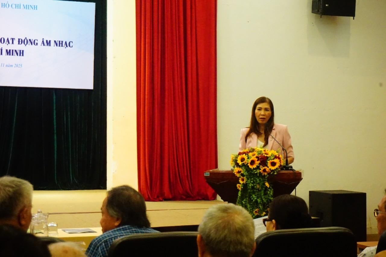 PGS.TS, Nhà giáo ưu tú Nguyễn Thị Mỹ Liêm - Phó Chủ tịch Hội Âm nhạc TPHCM - báo cáo đề dẫn buổi tọa đàm.