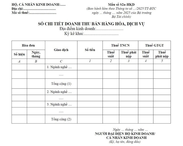 Sổ chi tiết doanh thu bán hàng hóa, dịch vụ - mẫu S2A dự kiến áp dụng với hộ kinh doanh doanh thu 200 triệu đồng đến 3 tỷ đồng.