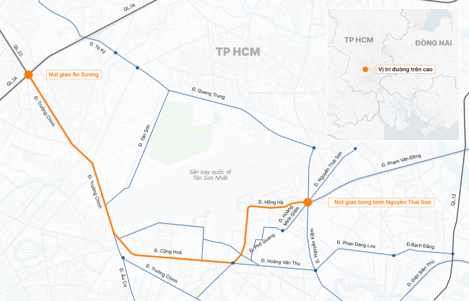 Hướng tuyến đường trên cao kết nối sân bay Tân Sơn Nhất được đề xuất. Đồ họa: Tâm Thảo