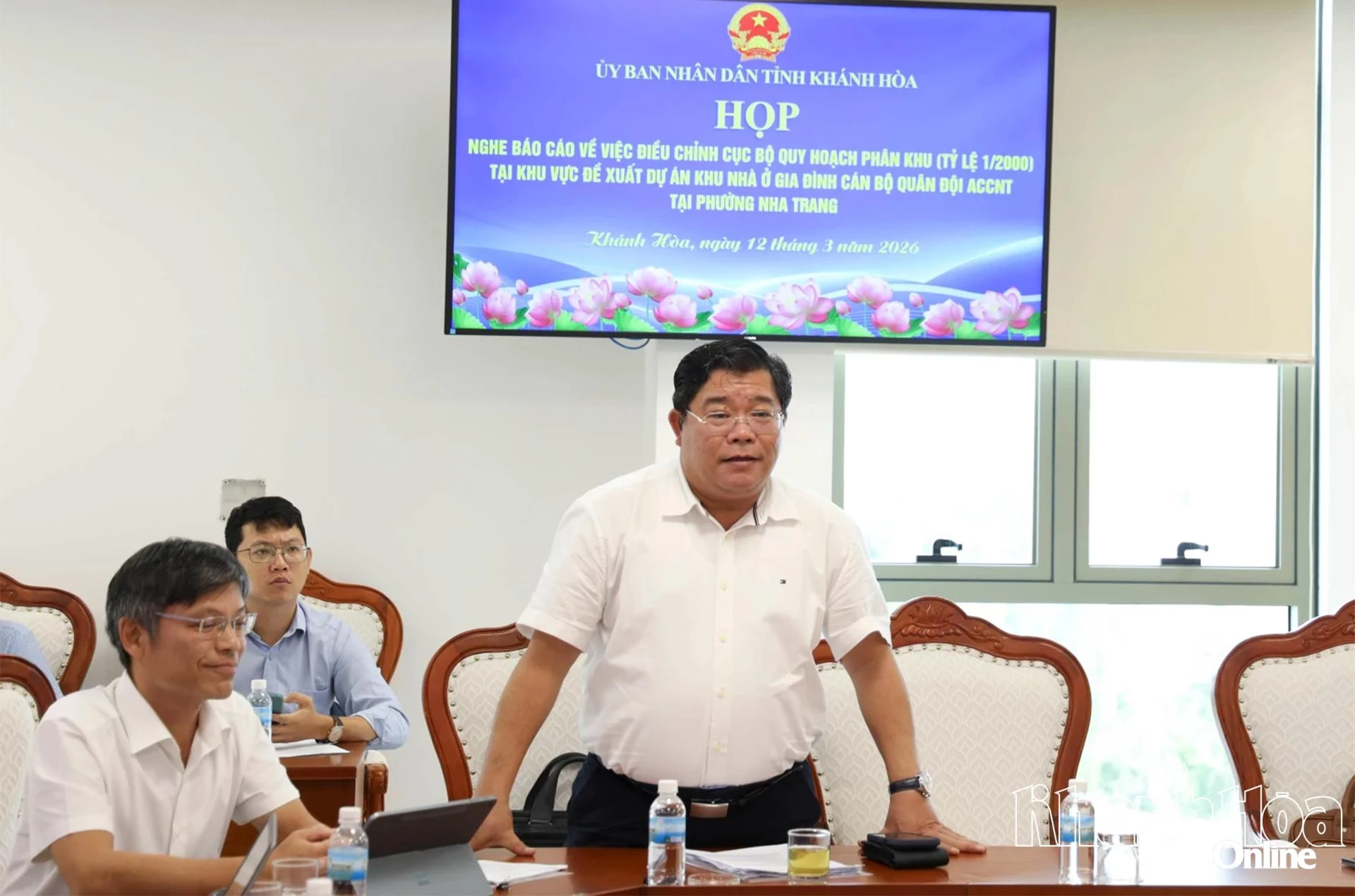 Chiều 12-3, đồng chí Trần Hòa Nam - Ủy viên Ban Thường vụ Tỉnh ủy, Phó Chủ tịch UBND tỉnh Khánh Hòa chủ trì cuộc họp với các sở, ban, ngành, đơn vị về đề xuất điều chỉnh cục bộ quy hoạch phân khu (tỷ lệ 1/2000) tại khu vực đề xuất Dự án Khu nhà ở gia đình cán bộ quân đội ACC-NT.