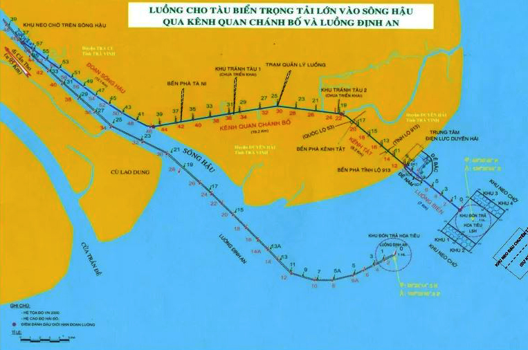 Sơ đồ luồng cho tàu biển trọng tải lớn vào sông Hậu qua kênh Quan Chánh Bố và luồng Định An.