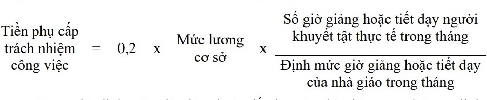 b) Mức 0,2 so với mức lương cơ sở áp dụng đối với nhà giáo được giao nhiệm vụ tổ phó chuyên môn hoặc tổ phó bộ môn theo quy định của pháp luật; nhà giáo trực tiếp giảng dạy người khuyết tật theo phương thức giáo dục hòa nhập trong các cơ sở giáo dục không phải là trường chuyên biệt, trung tâm hỗ trợ phát triển giáo dục hòa nhập theo số giờ giảng hoặc tiết dạy người khuyết tật thực tế;