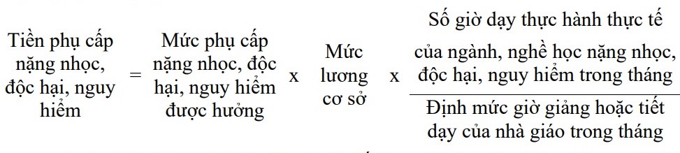 a) Cách tính tiền phụ cấp nặng nhọc, độc hại, nguy hiểm thực hiện theo quy định hiện hành của pháp luật. Riêng trường hợp nhà giáo quy định tại Điều này được tính theo số giờ dạy thực hành thực tế của ngành, nghề học nặng nhọc, độc hại, nguy hiểm, cụ thể như sau: