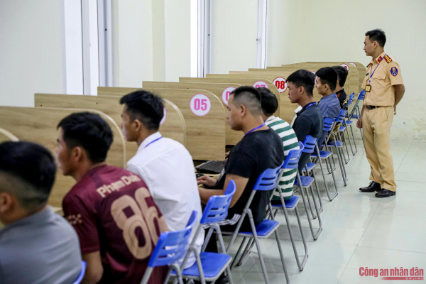 Các thí sinh thực hiện thi lý thuyết trong kỳ thi sát hạch cấp GPLX xe cơ giới đường bộ do Công an TP Hà Nội tổ chức.