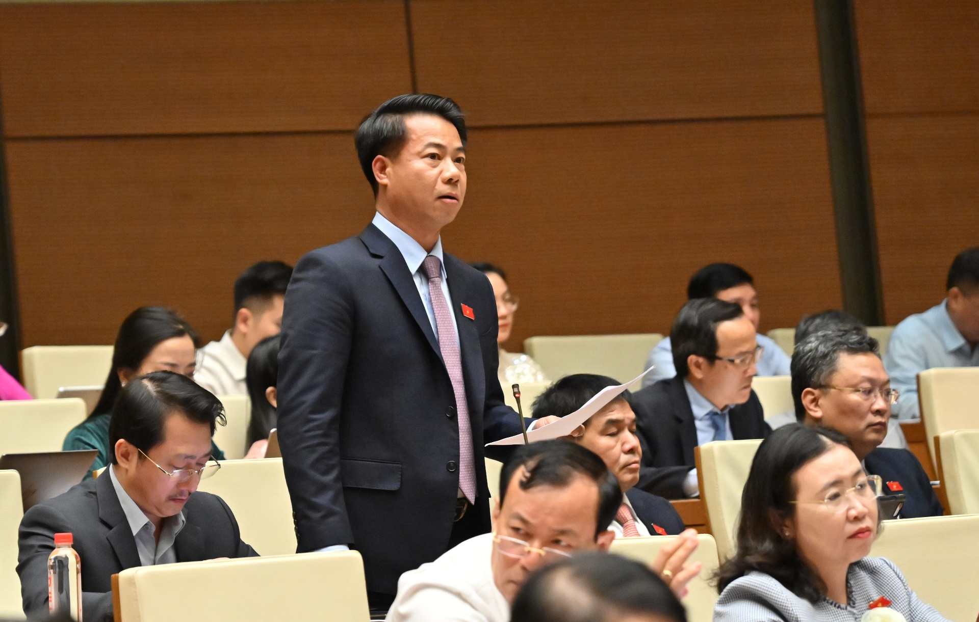 Đại biểu Hoàng Quốc Khánh - Tỉnh ủy viên, Phó Trưởng đoàn Đại biểu Quốc hội Chuyên trách khóa XVI tỉnh Lai Châu phát biểu thảo luận tại hội trường.