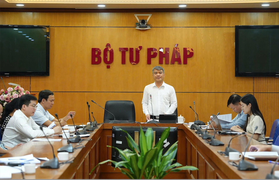 Thứ trưởng Bộ Tư pháp Nguyễn Thanh Tú chủ trì cuộc họp. Ảnh: HM