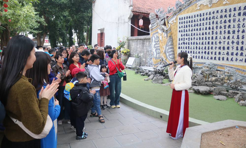 Du khách nghe thuyết minh về Chiếu dời đô tại di tích quốc gia đặc biệt Đền Đô (phường Từ Sơn).