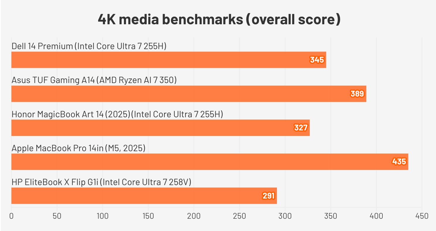 Trong các bài kiểm tra đa phương tiện, máy đạt điểm số ấn tượng 345 điểm, xử lý mượt mà các tệp video 4K nặng. Hệ thống tản nhiệt hoạt động hiệu quả khi quạt chỉ phát ra tiếng thì thầm ngay cả khi CPU và GPU hoạt động ở cường độ cao.