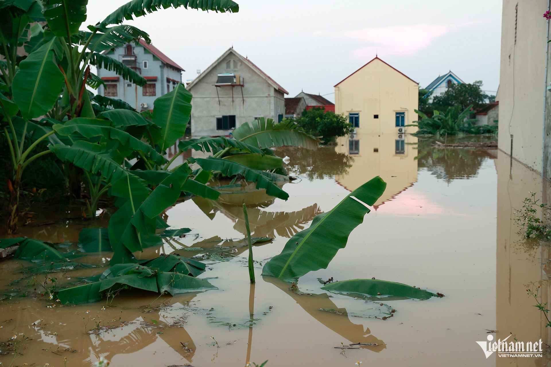 Đứng trên đê ngóng về nhà – nơi chồng và mẹ chồng vẫn đang “mắc kẹt”, chị Vương Thị Chung, ở xóm 5, thôn Ngô Đạo (xã Đa Phúc), kể rằng nhà chị cao nhất xóm nên sáng 9/10 vẫn chưa bị ngập.