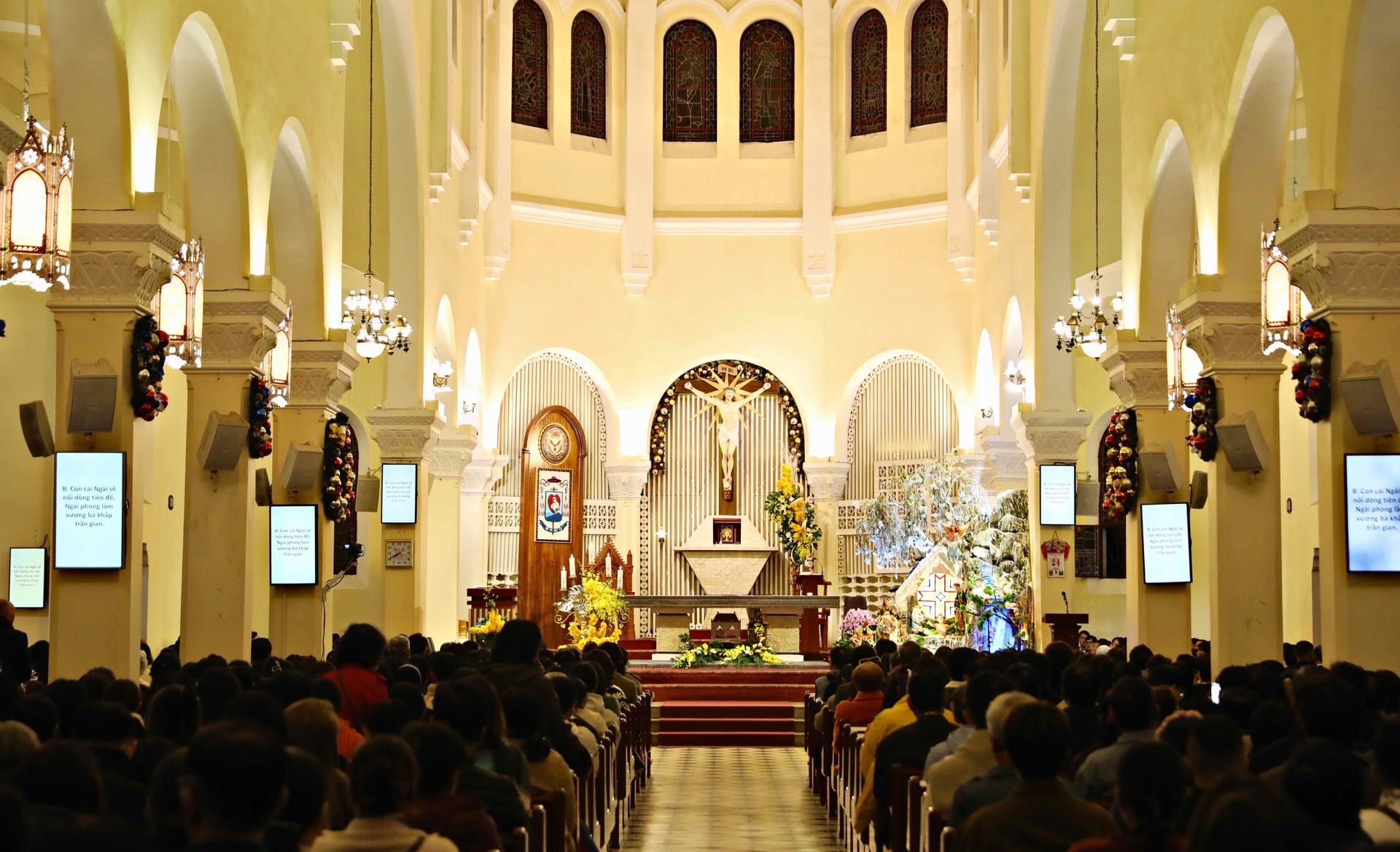 Phía trong các nhà thờ, các giáo dân di chuyển về đông đúc để dự thánh lễ trong khi cũng có hàng ngàn du khách, người dân tới nhà thờ để vui chơi, chụp ảnh lưu niệm quanh khu vực nhà thờ