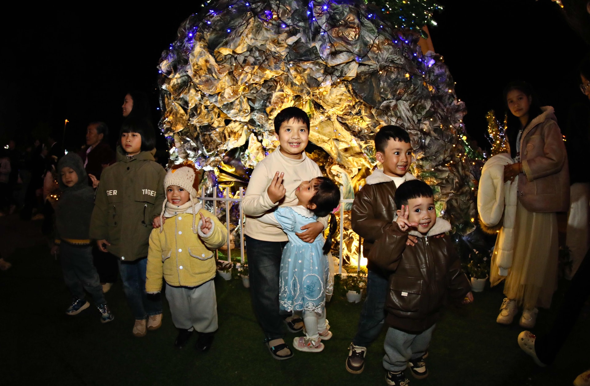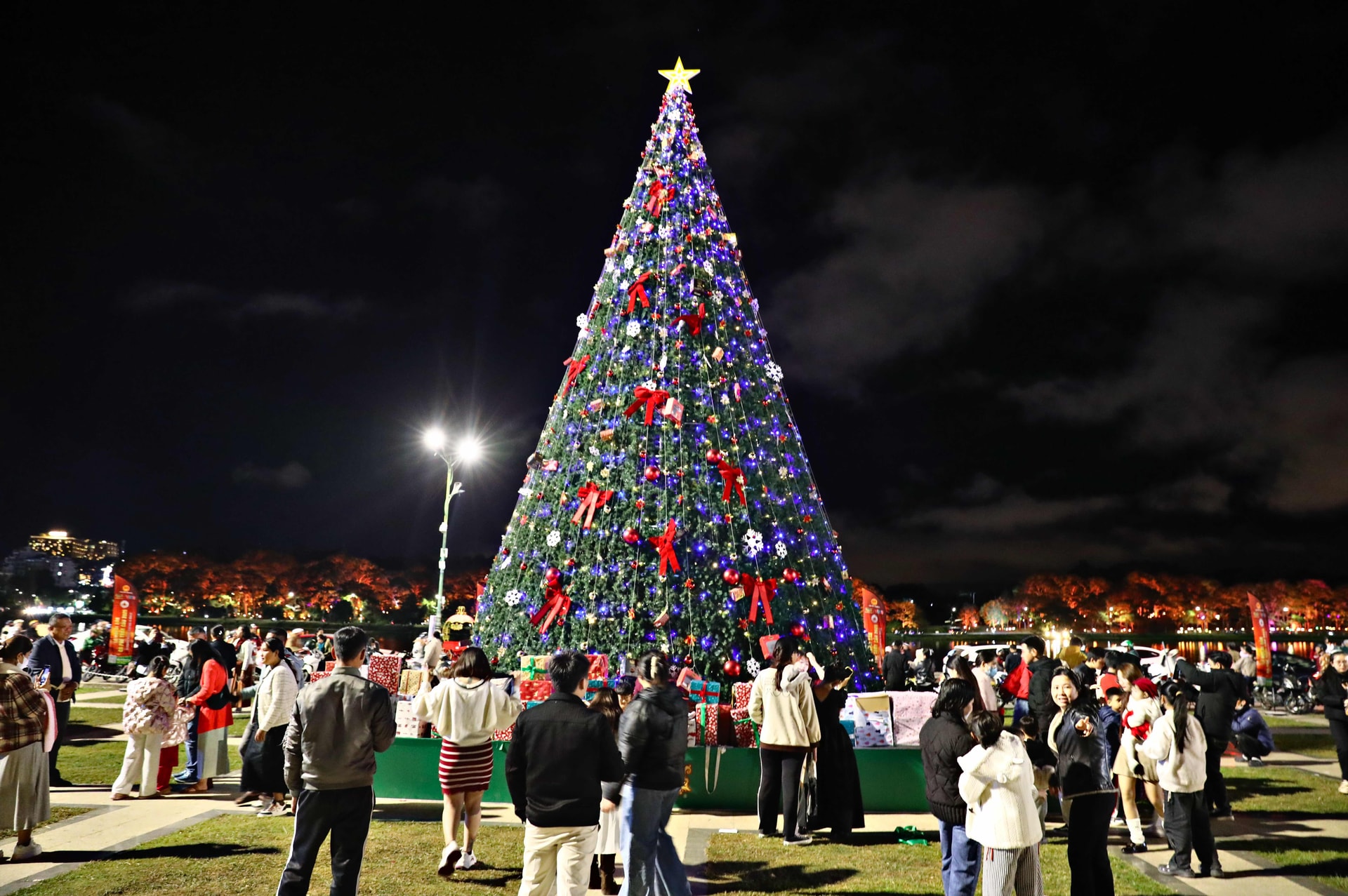 Người dân chụp ảnh lưu niệm, vui chơi bên cây thông noel khổng lồ được trang hoàng tại quảng trường Lâm Viên
