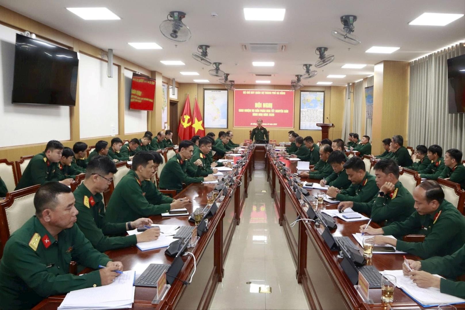 Toàn cảnh hội nghị giao nhiệm vụ bắn pháo hoa đêm giao thừa Tết Bính Ngọ 2026 do Bộ CHQS TP Đà Nẵng tổ chức.
