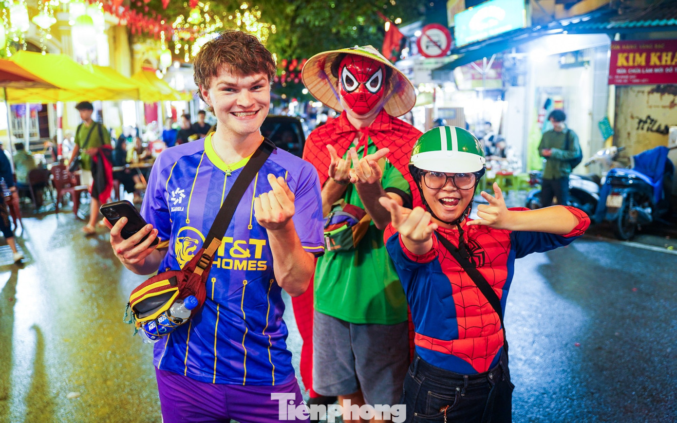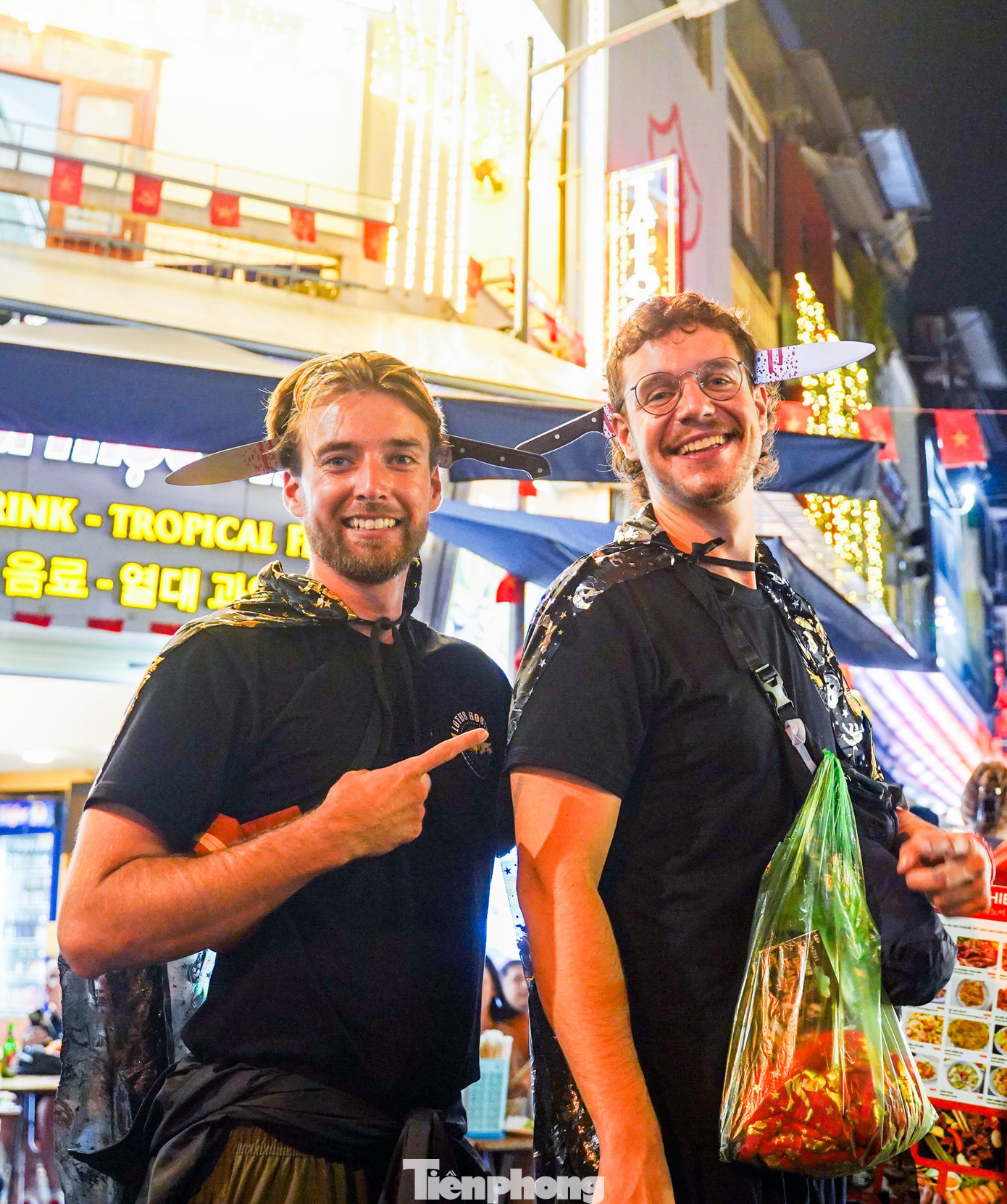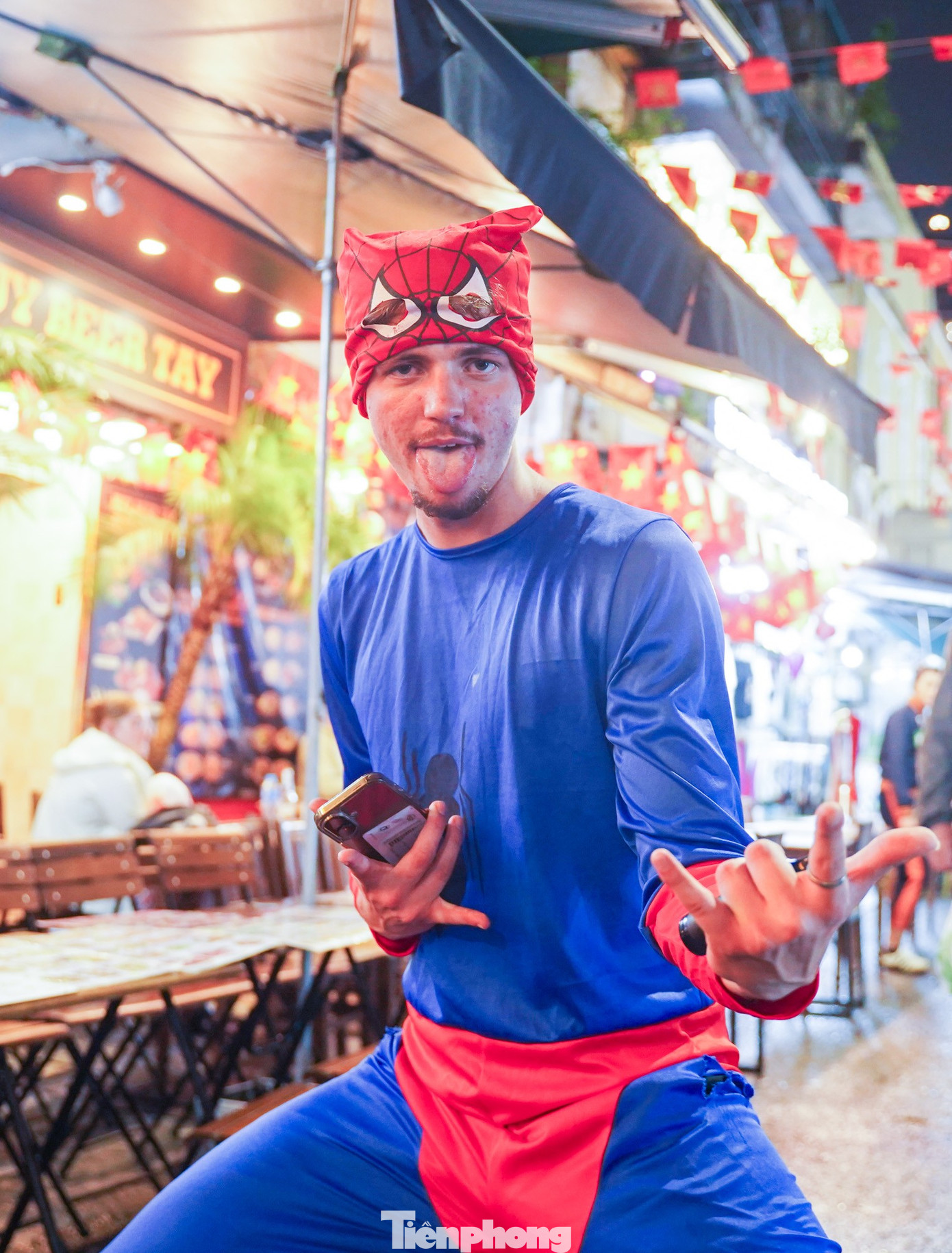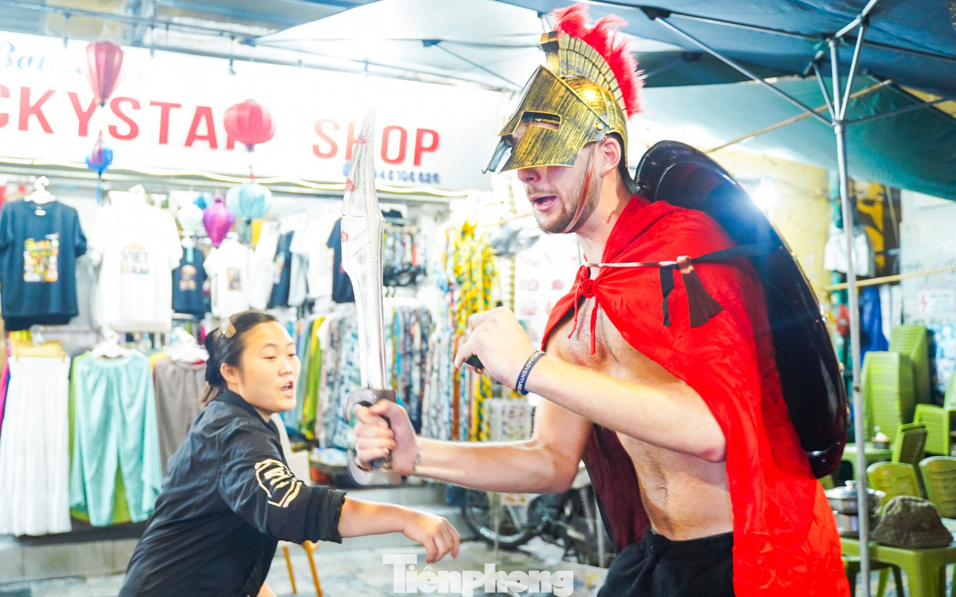 Một vị khách nước ngoài hóa trang thành chiến binh, vui vẻ trêu đùa người dân trên phố Tạ Hiện.