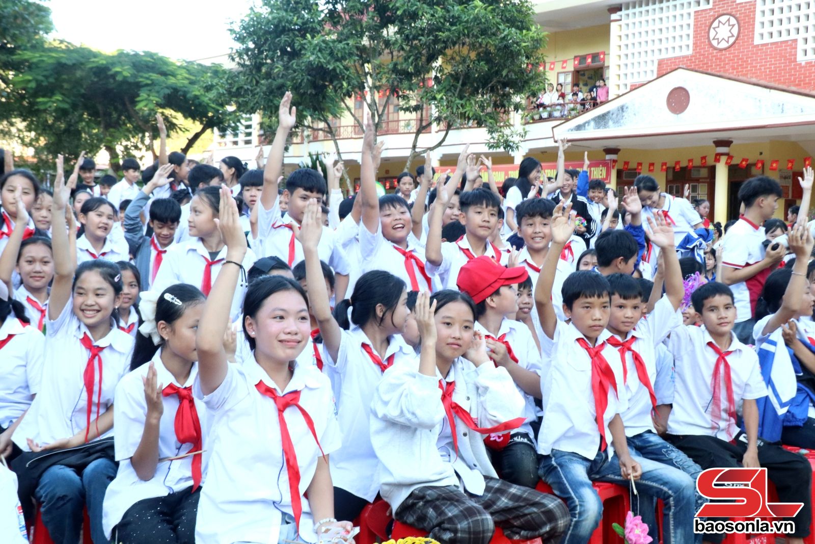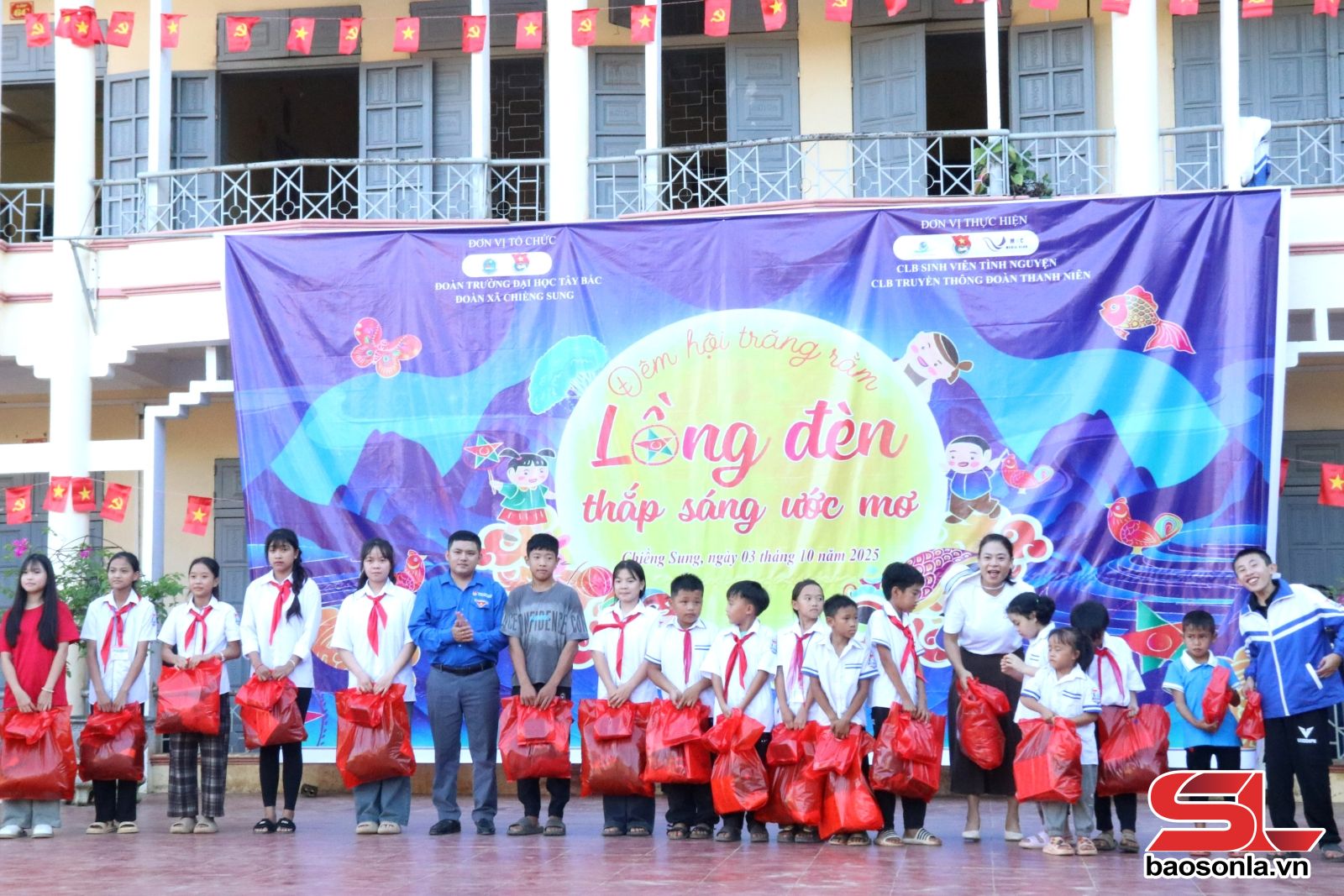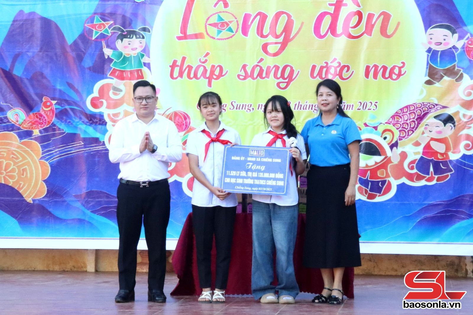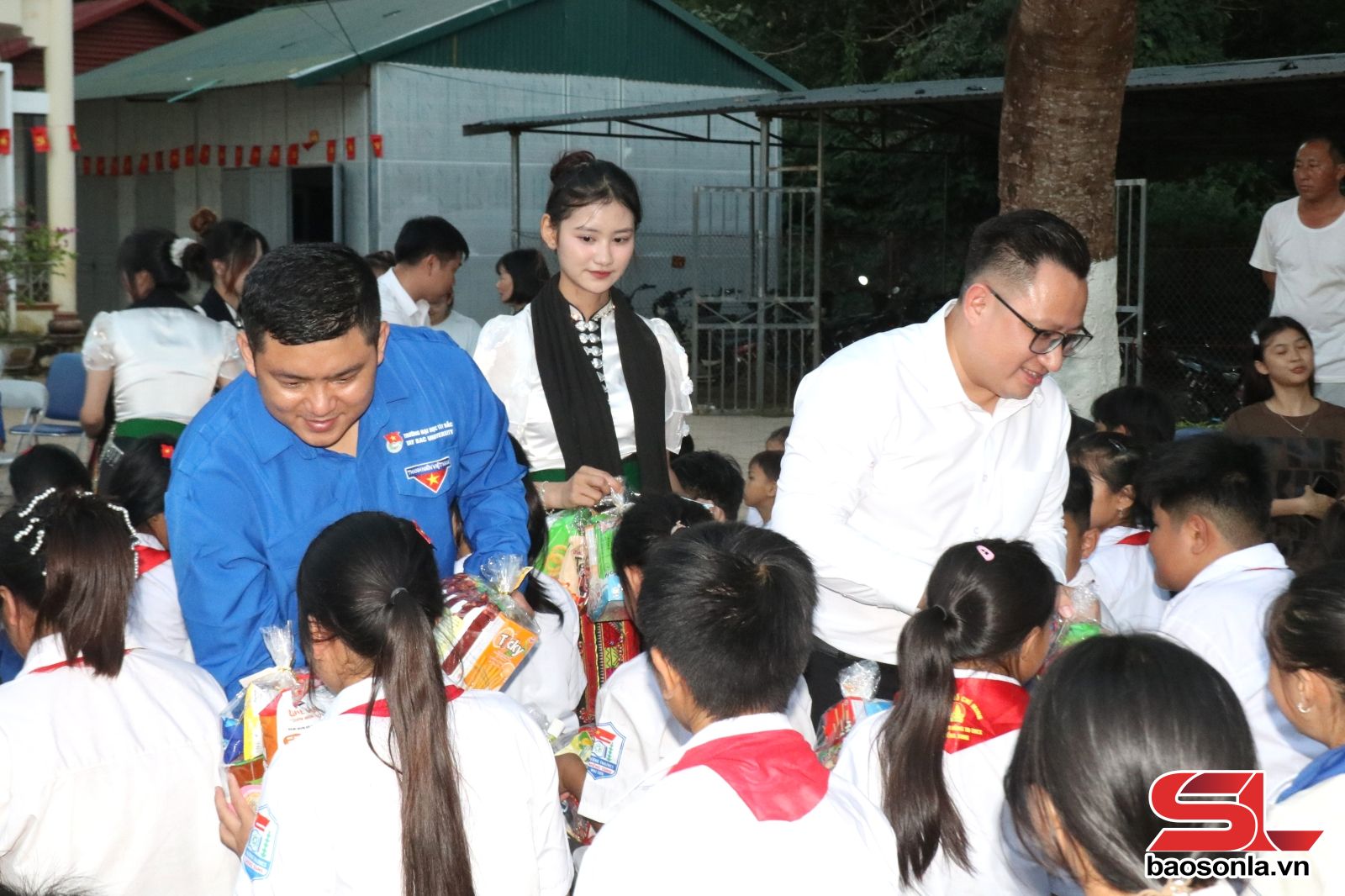Nhân dịp này, Đoàn đã trao tặng 200 suất quà bánh kẹo, 120 bộ đồ dùng học tập, 50 balo tiểu học, 50 thùng mì tôm cho các em nhỏ có hoàn cảnh khó khăn. Đảng ủy xã Chiềng Sung trao tặng 300 thùng sữa cho các em học sinh, động viên các em tiếp tục nỗ lực vươn lên trong học tập.