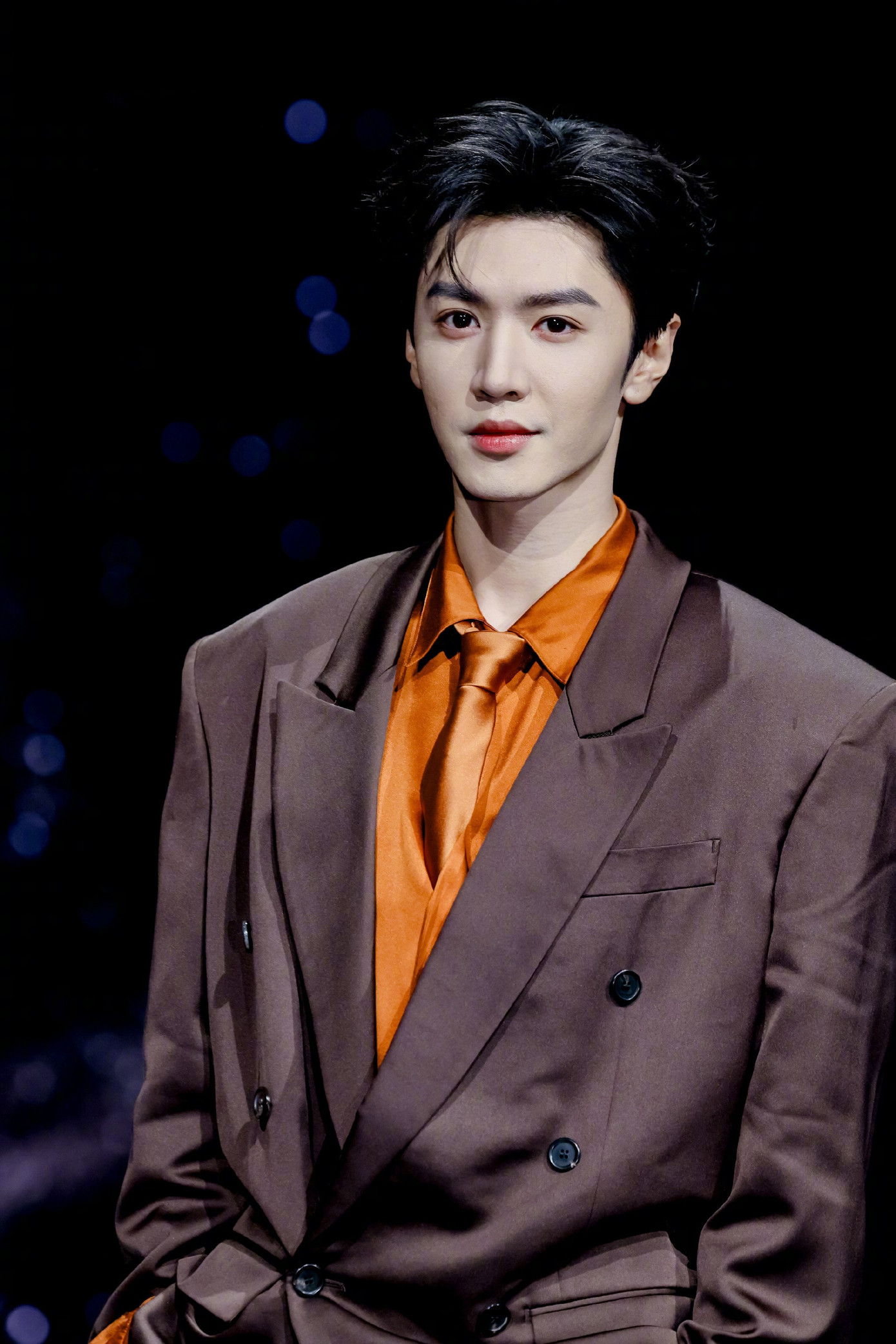 Trần Triết Viễn mặc suit của Saint Laurent. Phần thân trên nam tính, bảnh bao với sắc cam của sơ-mi và cà vạt, nhưng ảnh chụp toàn thân lại "bị dìm" tỉ lệ khiến chân anh ngắn hơn dù cao đến 1m8.