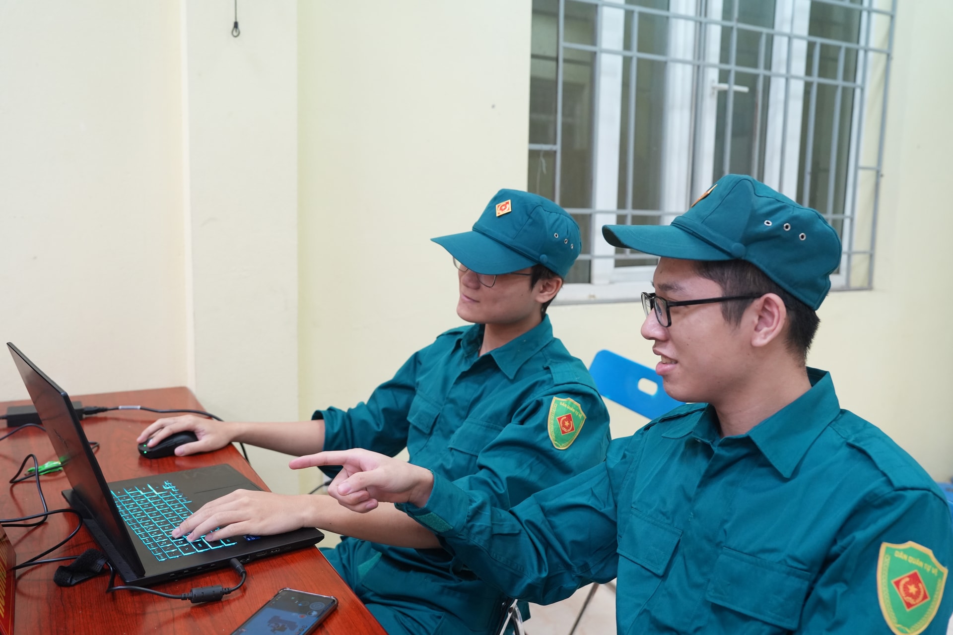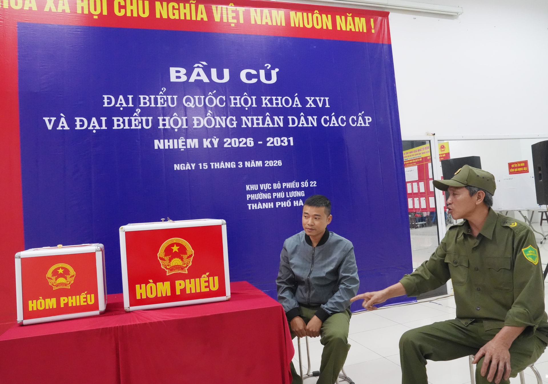 Hai bạn trẻ lực lượng dân quân tự vệ Nguyễn Tiến Mạnh và Nguyễn Tiến Quang Thái tại khu vực bỏ phiếu số 19, cho biết đến khuya mới đổi ca.