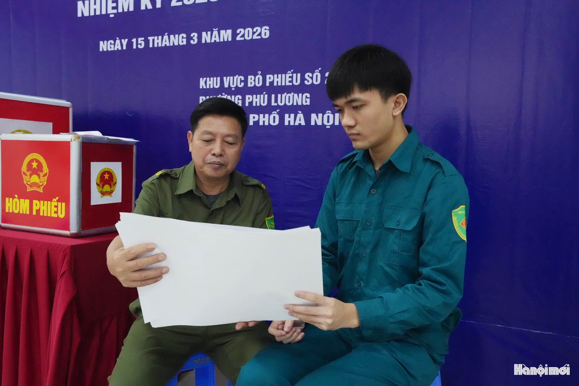 Thượng úy Bá Minh Tú Anh cùng lực lượng dân quân tự vệ kiểm tra hòm phiếu tại khu vực bỏ phiếu số 22.