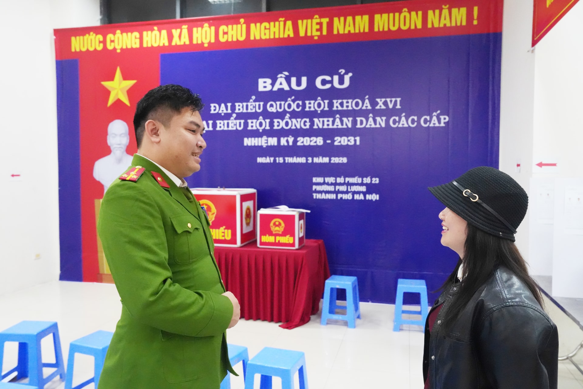 Thượng úy Nguyễn Hoàng Phi Long - Công an phường Phú Lương trao đổi với cử tri tại khu vực bỏ phiếu số 23.