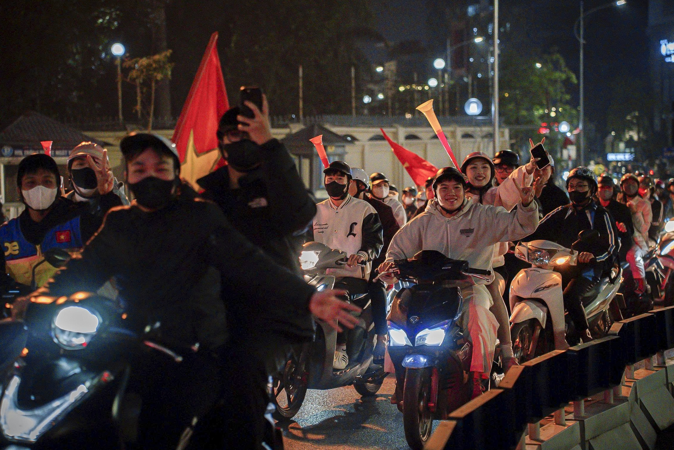 Trong không khí ăn mừng chiến thắng, dòng người mang cờ đỏ sao vàng nối đuôi đổ ra phố, "đi bão" với tiếng kèn, tiếng trống vang lên không dứt. Hình ảnh chụp người dân tại nút giao Đê La Thành, Cầu Giấy (Hà Nội) lúc 23h05. Ảnh: Trần Hiền.