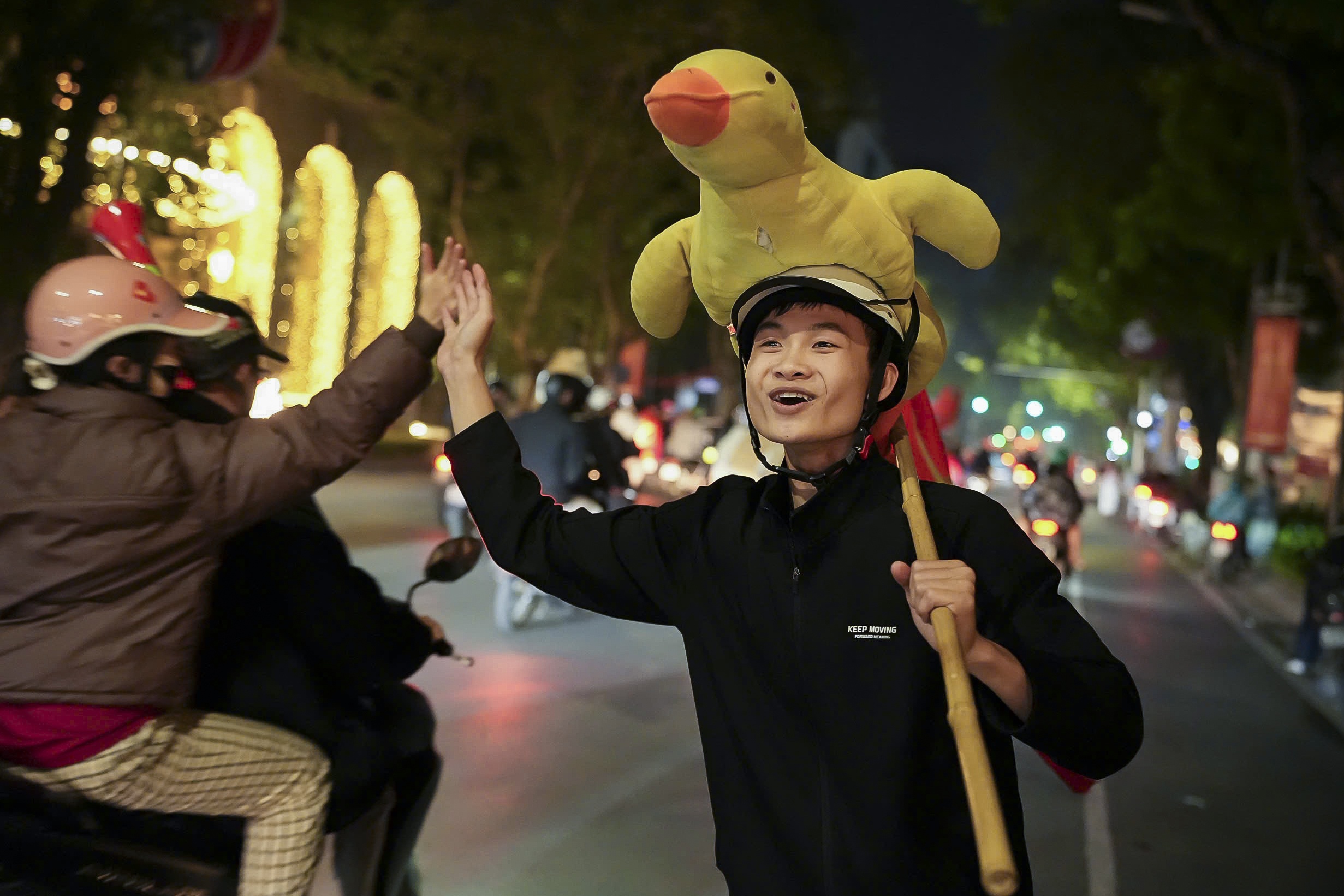 Một thanh niên cầm thú bông hình con gà, vui mừng đập tay người "đi bão" chiều ngược lại sau chiến thắng của đội tuyển bóng đá Việt Nam tại một góc phố Ngô Quyền lúc 23h23 ngày 18/12. Ảnh: Trần Hiền.