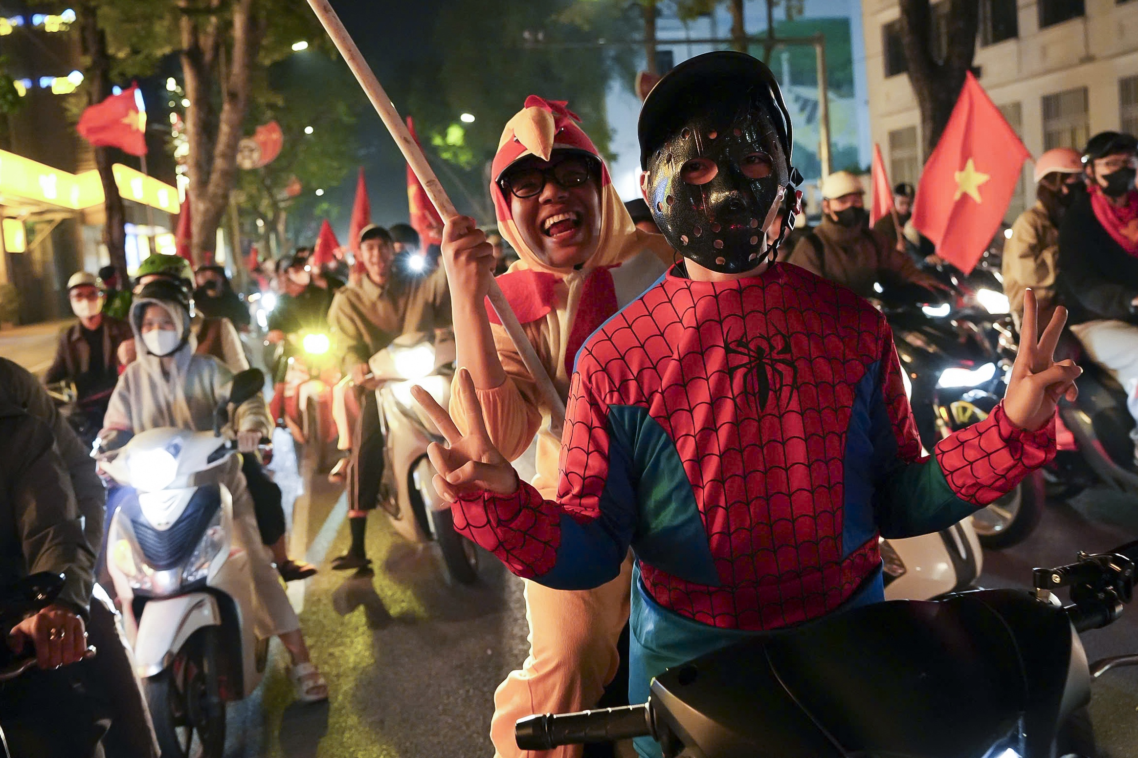 Ghi nhận của phóng viên, tại một số tuyến phố đi bộ và khu vực trung tâm, nhiều bạn trẻ xuất hiện trong trang phục cosplay, hóa thân thành các nhân vật hoạt hình, siêu anh hùng hoặc mặc áo đấu đội tuyển kết hợp phụ kiện sáng tạo. Những màn hóa trang độc đáo nhanh chóng thu hút sự chú ý, trở thành điểm nhấn thú vị giữa dòng người ăn mừng, đồng thời được chia sẻ rộng rãi trên mạng xã hội. Ngoài ra, tiếng hô "Việt Nam vô địch" vang lên không ngớt. Hình ảnh chụp phố Ngô Quyền (Hà Nội) lúc 23h23 ngày 18/12. Ảnh: Trần Hiền.