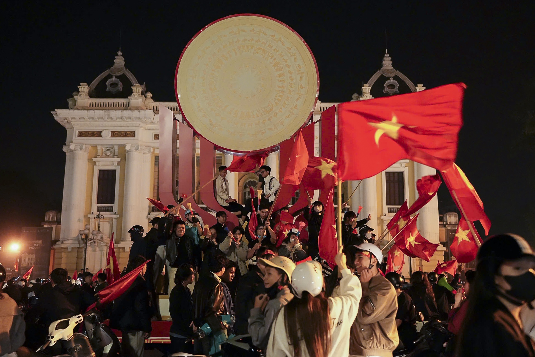 Hàng nghìn người dân ăn mừng chiến thắng trước Nhà hát Lớn (Hà Nội) lúc 23h50 ngày 18/12. Ảnh: Trần Hiền.