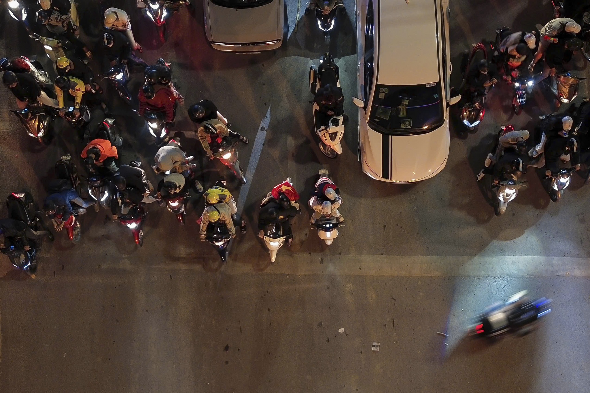 Dù không khí ăn mừng cuồng nhiệt, trật tự đô thị nhìn chung vẫn được đảm bảo. Tại nhiều ngã tư lớn, người dân vẫn dừng xe chấp hành tín hiệu đèn đỏ, nhường đường cho các phương tiện khác. Hình ảnh chụp đoàn người "đi bão" đứng chờ đèn đỏ từ trên cao tại Vành đai 1, đường Đại Cồ Việt (Hà Nội) lúc 0h ngày 19/12. Ảnh: Việt Hà.