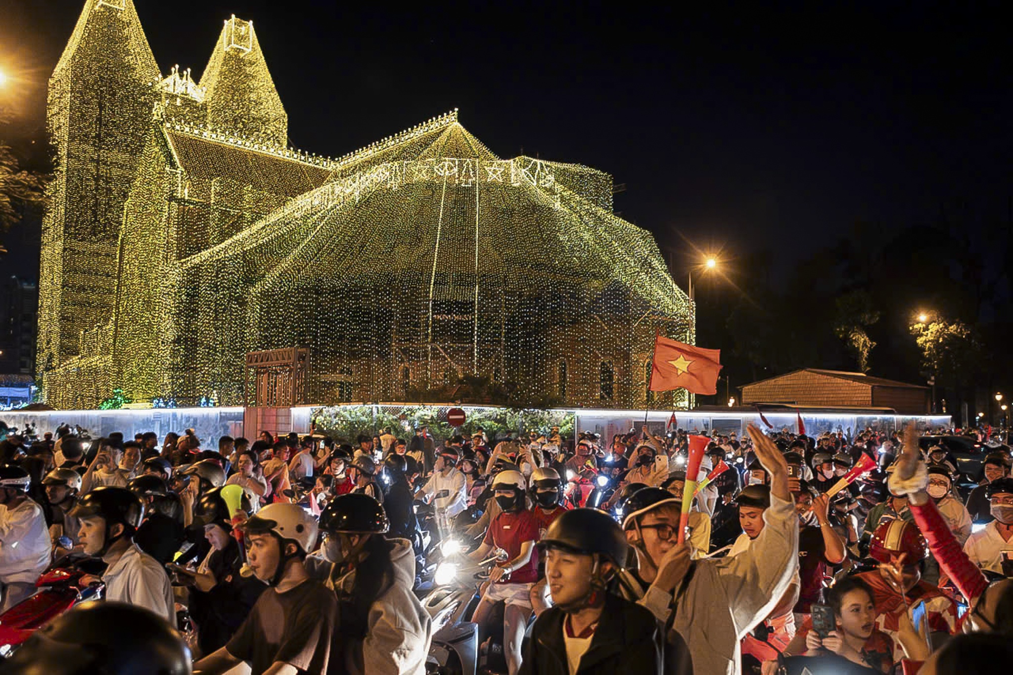 Dòng người tận hưởng không khí Giáng sinh tại Nhà thờ Đức Bà (TP.HCM), đồng thời mừng chiến thắng của đội tuyển U22 Việt Nam. Các cổ động viên sẵn sàng cho một đêm "đi bão" không ngủ, vui vì được hòa mình trong "biển người vui như Tết". Ảnh: Khương Nguyễn.