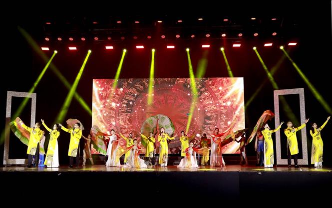Các nghệ sĩ Nhà hát Lạc Hồng Phú Thọ trình diễn tiết mục hát múa “Về đây Phú Thọ quê mình”. Ảnh: Hoàng Hùng/TTXVN