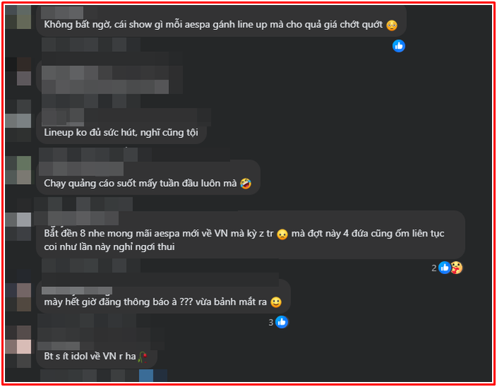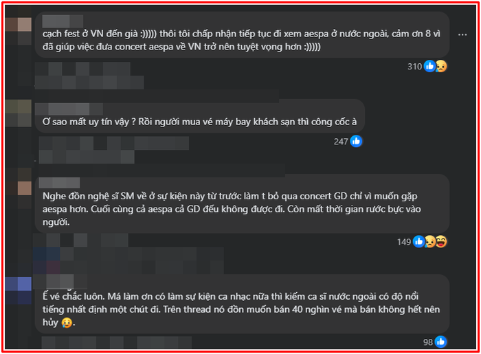 Thông tin hủy show ngay lập tức tạo nên làn sóng phản ứng dữ dội trên mạng xã hội. Hàng loạt khán giả, đặc biệt là fan aespa, bày tỏ sự hụt hẫng, tiếc nuối và giận dữ. Nhiều người đã đặt vé máy bay, khách sạn từ trước, dẫn đến thiệt hại tài chính đáng kể. Trong khi một số bình luận bày tỏ sự phẫn nộ, vẫn có những ý kiến cảm thông, cho rằng BTC xử lý "tử tế" hơn nhiều đơn vị từng hủy show nhưng không hoàn tiền.