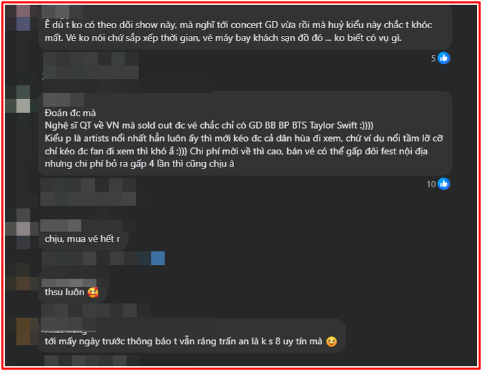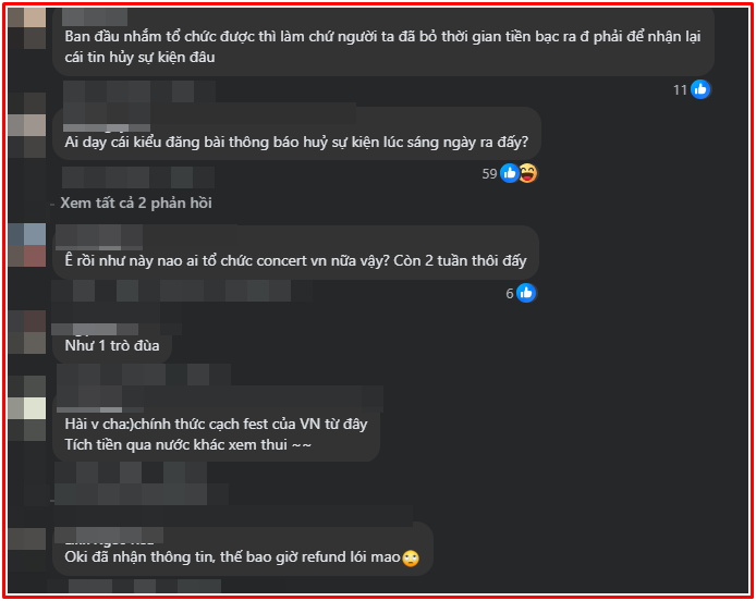 Việc hủy show chỉ cách ngày diễn ra khoảng hai tuần khiến nhiều người lo ngại về uy tín và tính chuyên nghiệp của thị trường tổ chức concert/festival tại Việt Nam. Đây không phải là lần đầu tiên các đơn vị tổ chức trong nước vướng vào tình huống tương tự, dẫn đến tâm lý dè chừng của khán giả khi quyết định mua vé cho những sự kiện tiếp theo.