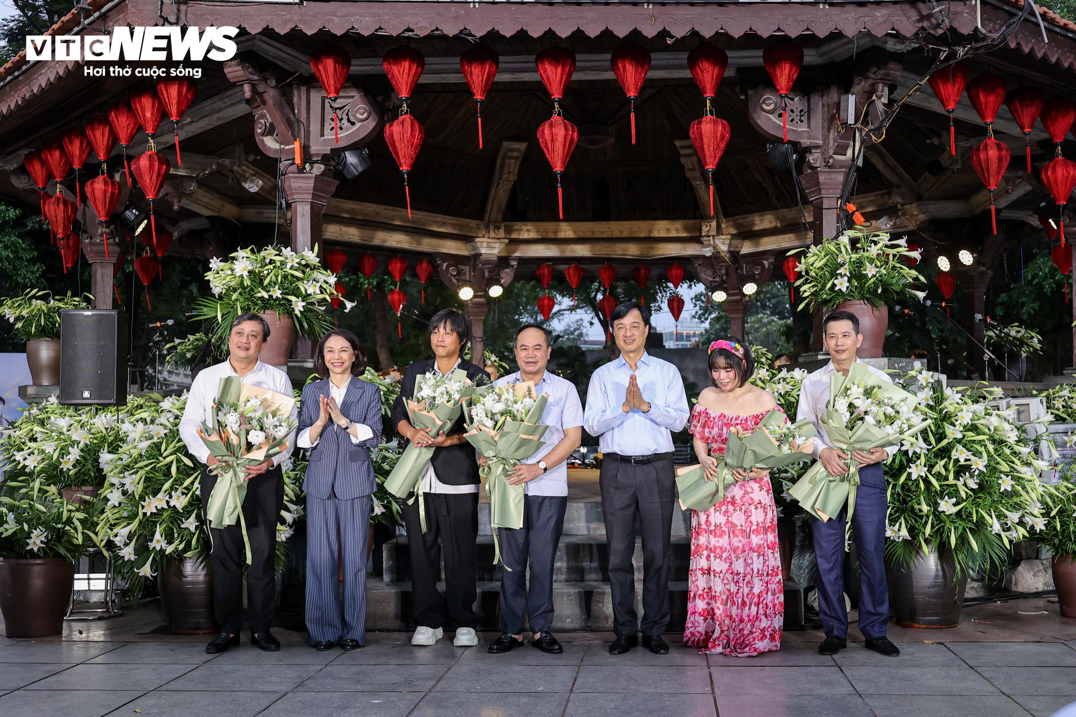 Ủy viên Bộ Chính trị, Bí thư Thành ủy Hà Nội Nguyễn Duy Ngọc và Phó Chủ tịch UBND TP Hà Nội Vũ Thu Hà tặng hoa chúc mừng các đơn vị tổ chức cùng nghệ sĩ tham gia chương trình.