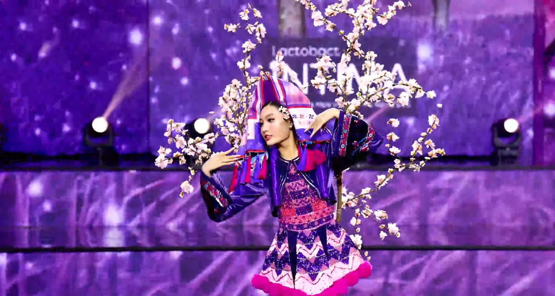 Á hậu 2 Miss Grand Vietnam 2023 - Trương Quí Minh Nhàn mang đến vẻ đẹp của văn hóa dân tộc Tày qua bộ trang phục được làm từ những tấm vải chàm truyền thống.