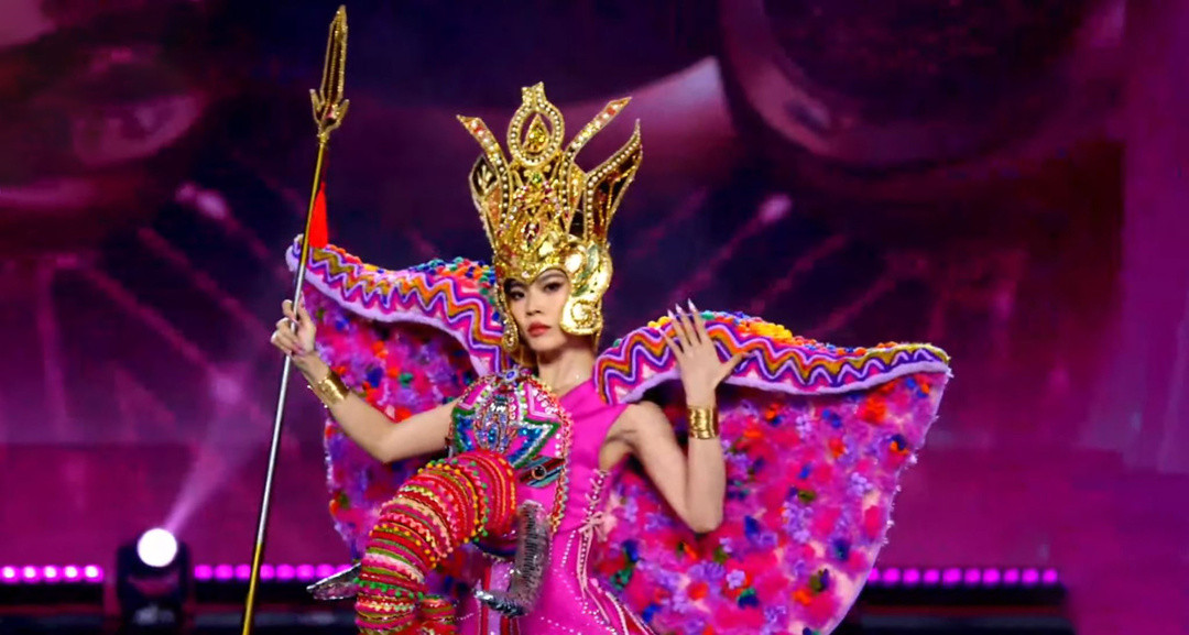Xuất hiện với thiết kế “Nam Hải ngọc lân”, Hoa hậu Hoàn vũ Việt Nam 2019 - Nguyễn Trần Khánh Vân thu hút sự chú ý khi khéo léo xử lý mô hình cá voi cồng kềnh và khó di chuyển.
