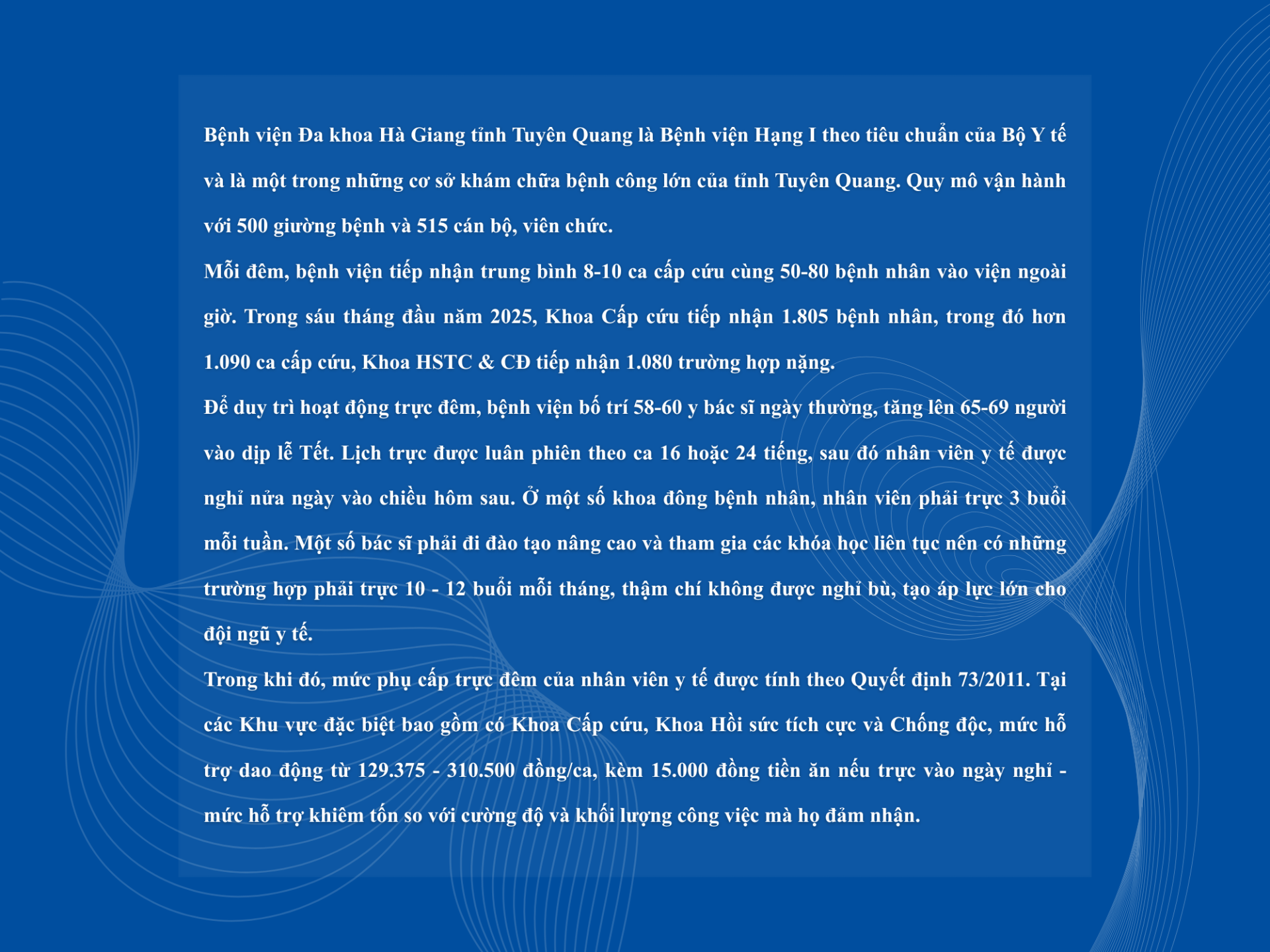 Bệnh viện Đa khoa Hà Giang, tỉnh Tuyên Quang. Trong buồng bệnh Khoa Cấp cứu, ngăn cách với phòng trực bằng bức tường kính như một “bốt gác”, người phụ nữ trung niên quằn quại ôm bụng, tiếng rên yếu ớt cứ lặp lại thành nhịp nền nặng nề cho căn phòng vốn đã đặc quánh không khí lo âu.