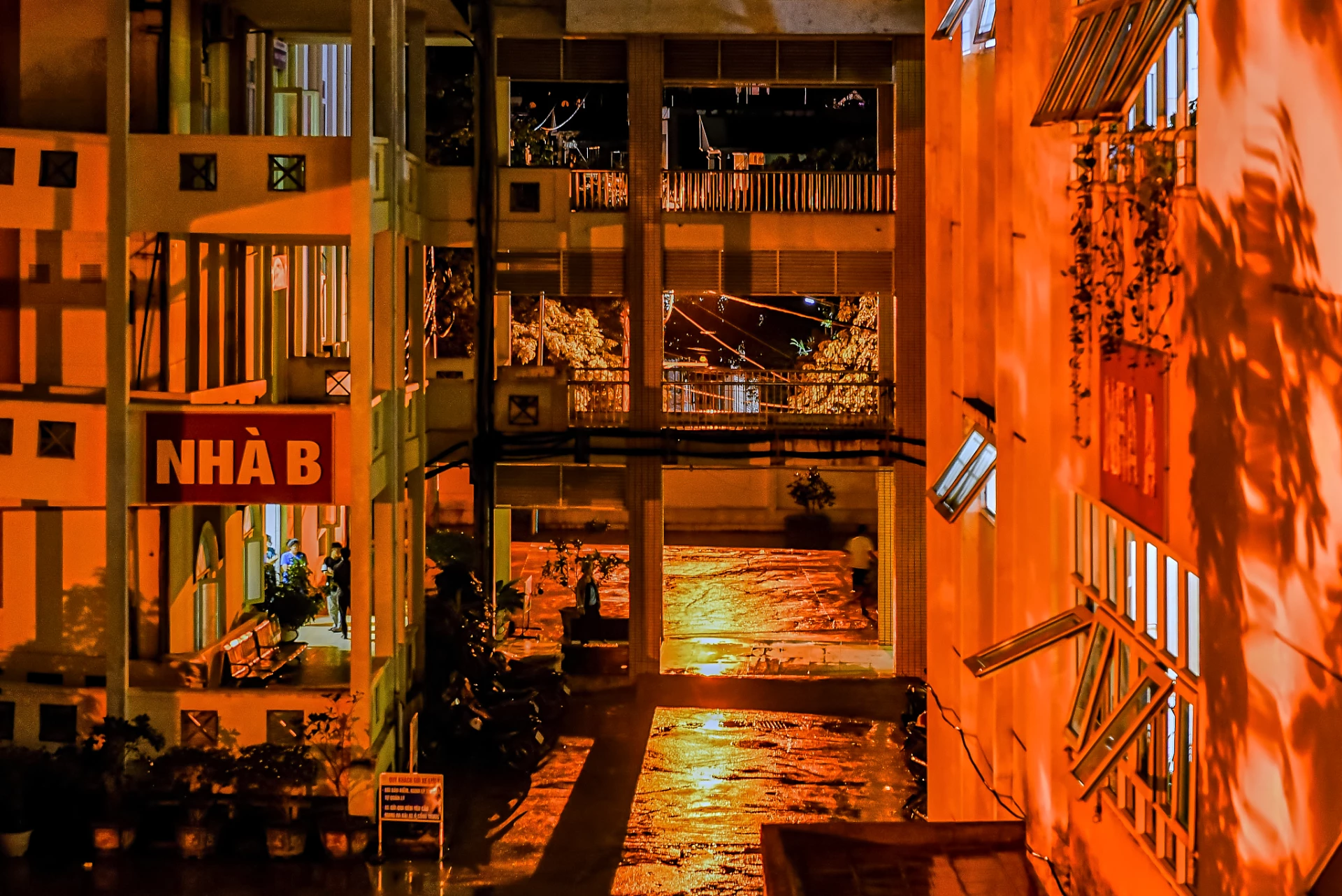 Bên ngoài, khoảng sân vắng lặng, thỉnh thoảng, tiếng xe cắt ngang màn đêm yên ắng.