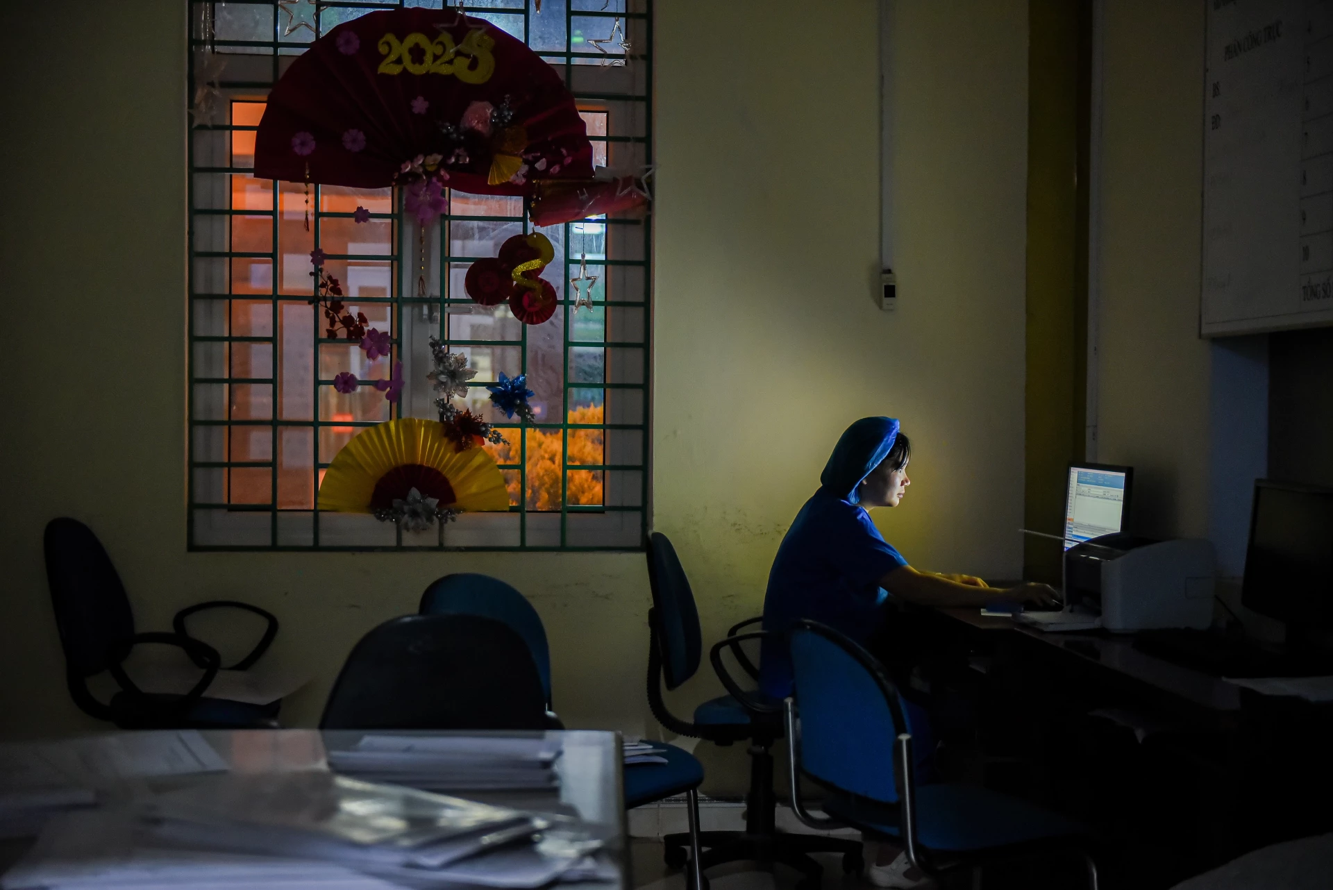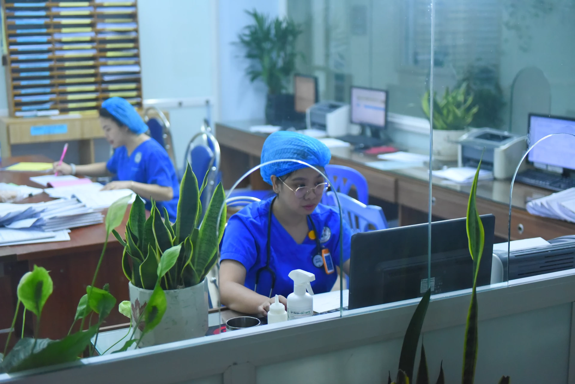 Một ca trực đêm kéo dài từ 5 giờ chiều đến 7 giờ sáng, nhưng ngay từ trước khi vào ca trực, ba điều dưỡng cùng một bác sĩ được phân công đã thay phiên nhau tiếp nhận, kiểm tra tình trạng bệnh nhân, cập nhật bệnh án giấy đến hệ thống điện tử.