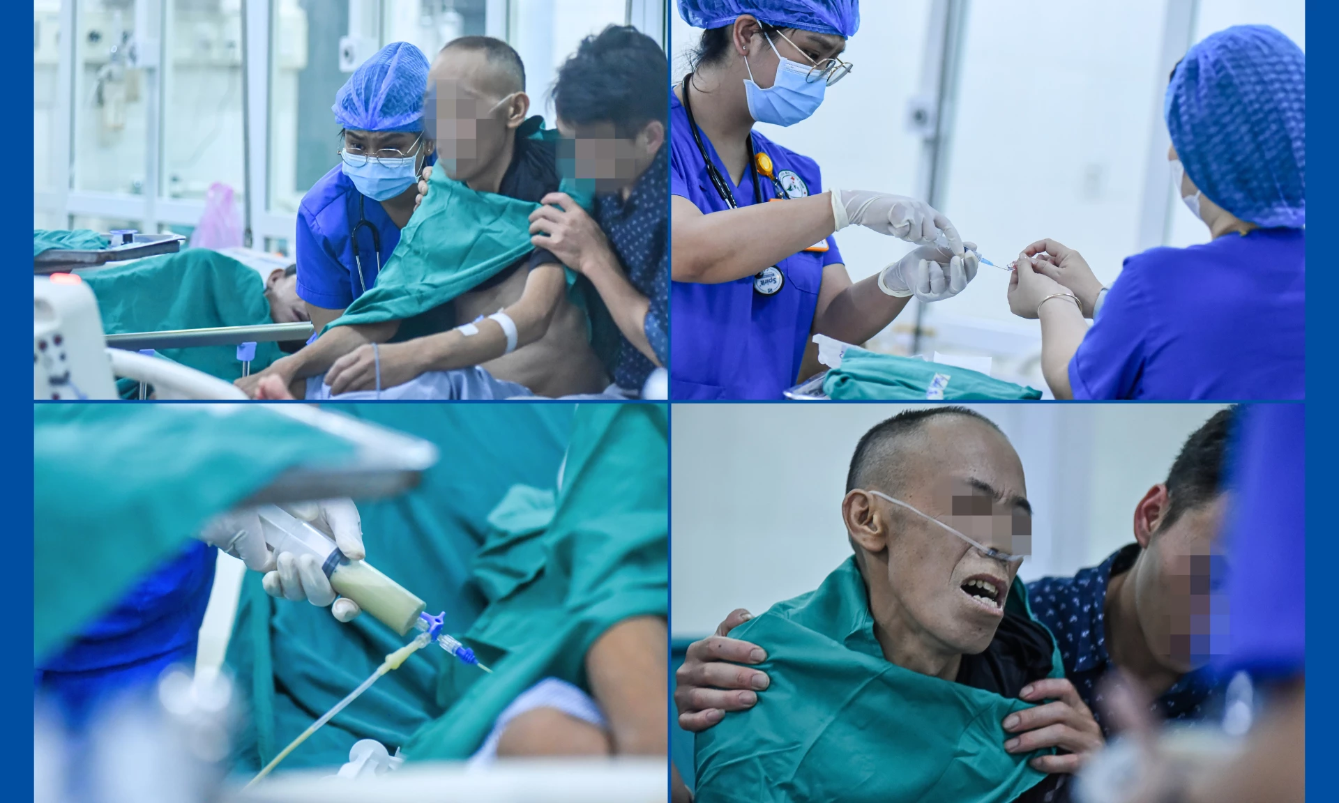 Các phòng bệnh được phân chia theo mức độ nguy kịch. Hai buồng ngoài dành cho những ca trung bình, trong khi buồng giữa là nơi chăm sóc đặc biệt, chỉ đội ngũ y tế mới được phép vào. Họ đều nằm bất động, gương mặt chằng chịt dây dẫn, ống thở và những túi dịch truyền. Từ ăn uống, vệ sinh cá nhân đều phải phụ thuộc vào nhân viên y tế chăm sóc.