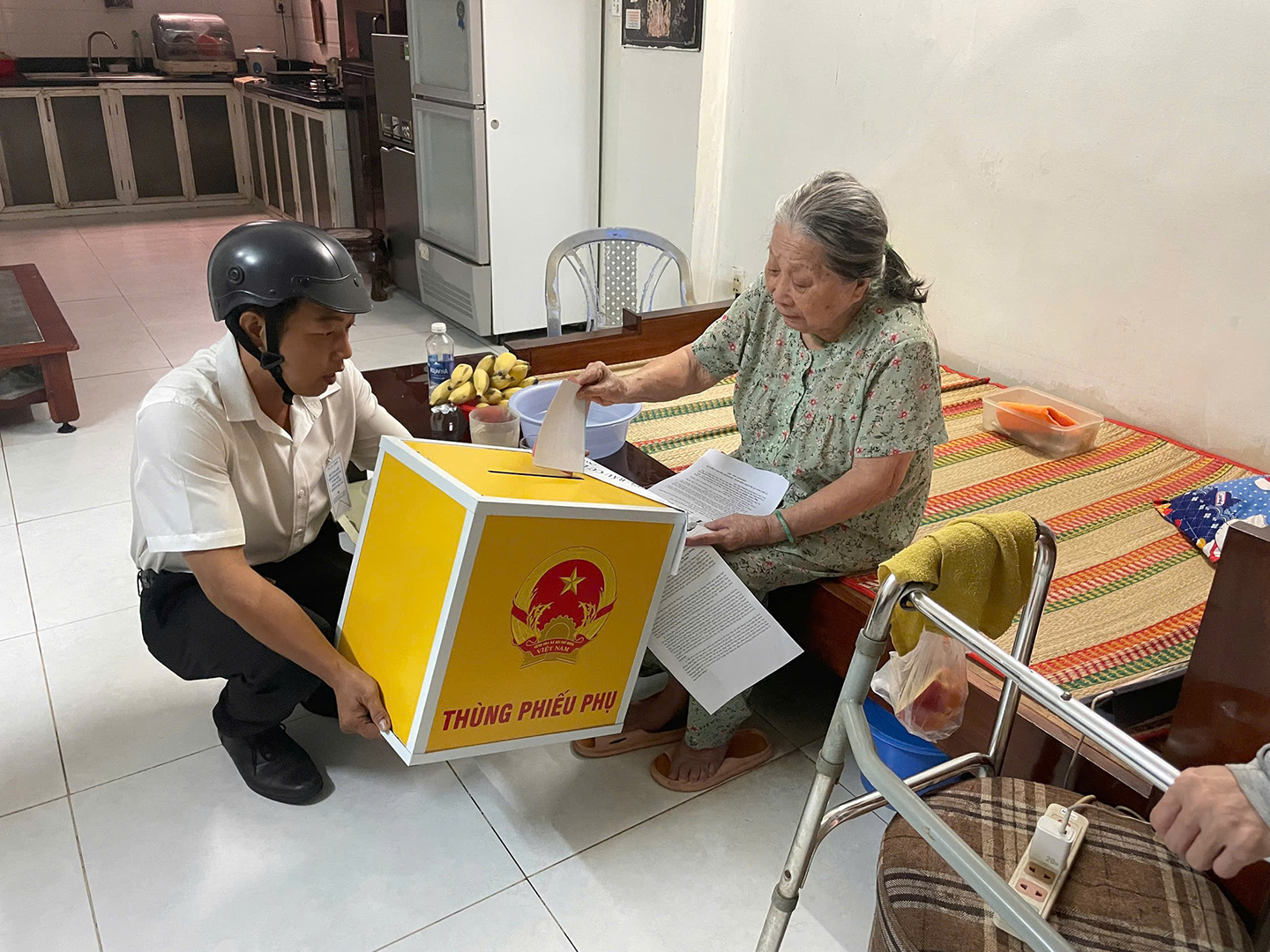 Đối với cử tri ốm đau, già yếu không thể đến phòng bỏ phiếu, tổ bầu cử sẽ mang hòm phiếu phụ và phiếu bầu đến tận nhà.