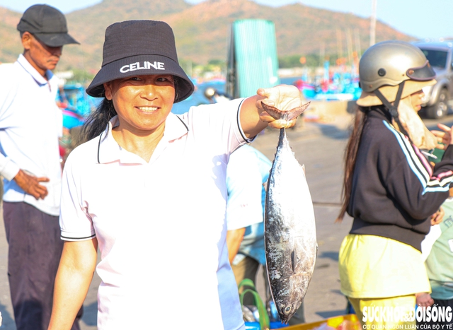 Một người phụ nữ giơ cao con cá thu còn tươi rói, ánh bạc lấp lánh dưới nắng, như một cách mời chào rất riêng của chợ biển, giản dị mà đầy sức hút. Ảnh: Duy Ngọc.